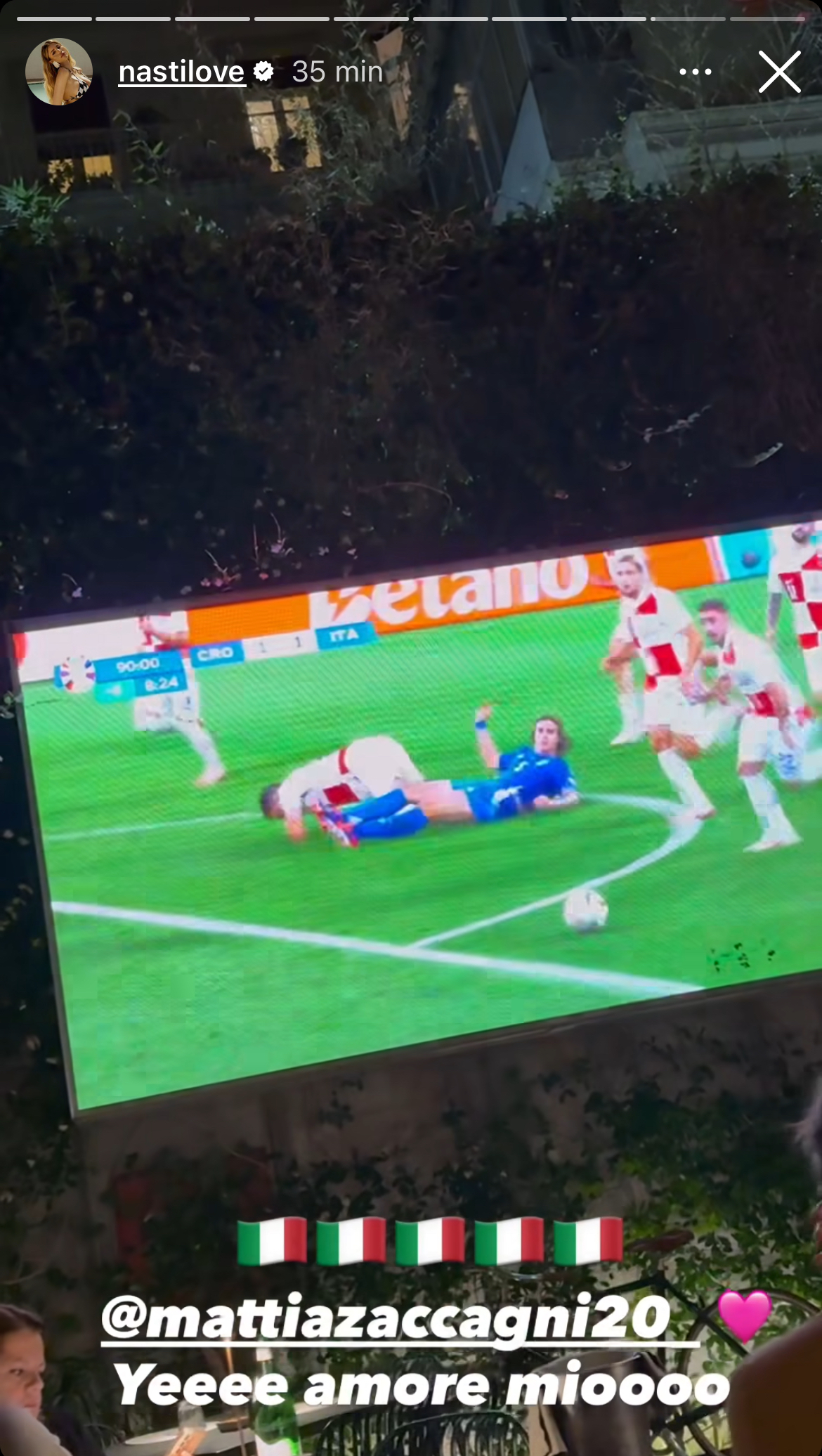 Gioia indescrivibile per Mattia Zaccagni. Subentrato nel match tra Croazia e Italia, l'esterno della Lazio ha trovato la rete del pareggio nel finale regalando agli azzurri il secondo posto nel girone B di Euro2024. Tramite una storia su Instagram, la moglie Chiara Nasti ha festeggiato la rete di suo marito con il video del gol e con un commento: "Yeee amore mio". Di seguito il post.