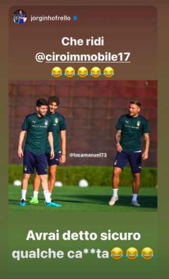 L'Italia si sta preparando alla seconda gara del girone di Euro 2020 contro la Svizzera. Dopo la convincente vittoria contro la Turchia c'è grande entusiasmo in casa azzurra e il clima sereno che si vive durante gli allenamenti lo dimostra. Ciro Immobile e Jorginho sono stati immortalati sorridenti durante la seduta, con la foto che è stata postata sui social prima dal centrocampista del Chelsea e poi dall'attaccante della Lazio: "Che ridi?", la domanda del fresco vincitore della Champions League, "Avrai detto sicuro qualche cazzata" la risposta senza mezzi termini del bomber biancoceleste.