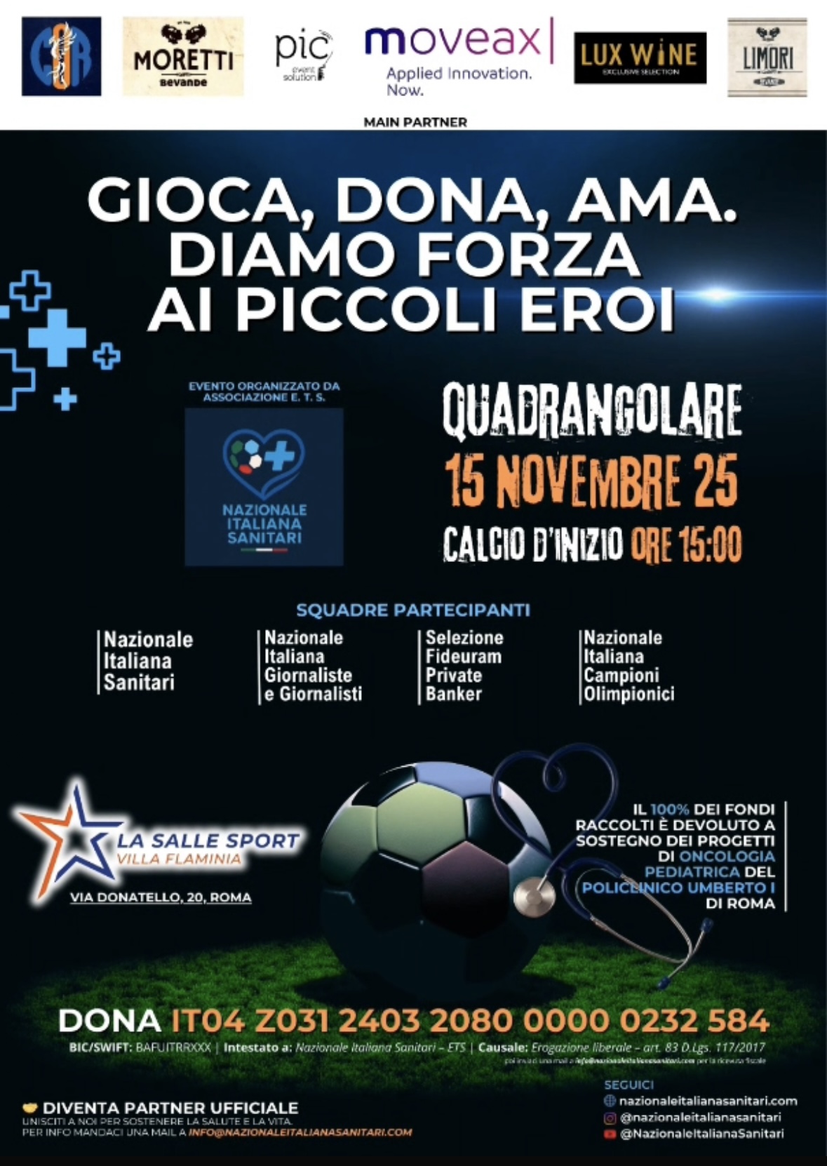 Il 15 novembre al circolo di Villa Flaminia, via Donatello, Roma, alle ore 15, si terrà un torneo quadrangolare di beneficenza! Luca Cipriano, presidente e capitano della Nazionale Italiana Sanitari ( si può seguire sui social sito o Instagram “nazionaleitalianasanitari” ) invita a contribuire e a effettuare una donazione, che servirà per il reparto oncologico di pediatria del policlinico Umberto 1! Inserire nella causale nome, cognome, codice fiscale e e-mail sarà fondamentale. Si ricorda che l’entrata sarà gratuita, saranno presenti numerose personalità del mondo politico, sportivo e dello spettacolo!