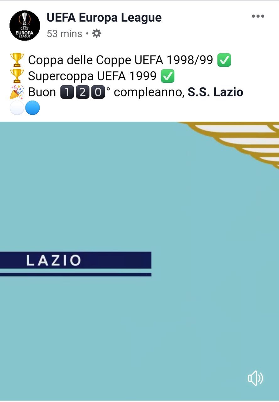 Centoventi anni di storia. La Lazio raggiunge uno storico traguardo, e lo festeggia godendosi le ultime vittorie in campionato e la Supercoppa alzata al cielo. Il cammino in Europa League, invece, non è andato come ci si aspettava: la compagine di Simone Inzaghi non ha superato la fase a gironi ed è uscito dalla competizione. Nonostante l’ultimo risultato, sui canali social del torneo sono apparsi gli auguri nei confronti della prima squadra della Capitale, vincitrice della Coppa delle Coppe del 1998/99 e della Supercoppa UEFA nello stesso anno: “Buon 120esimo compleanno, Lazio”.