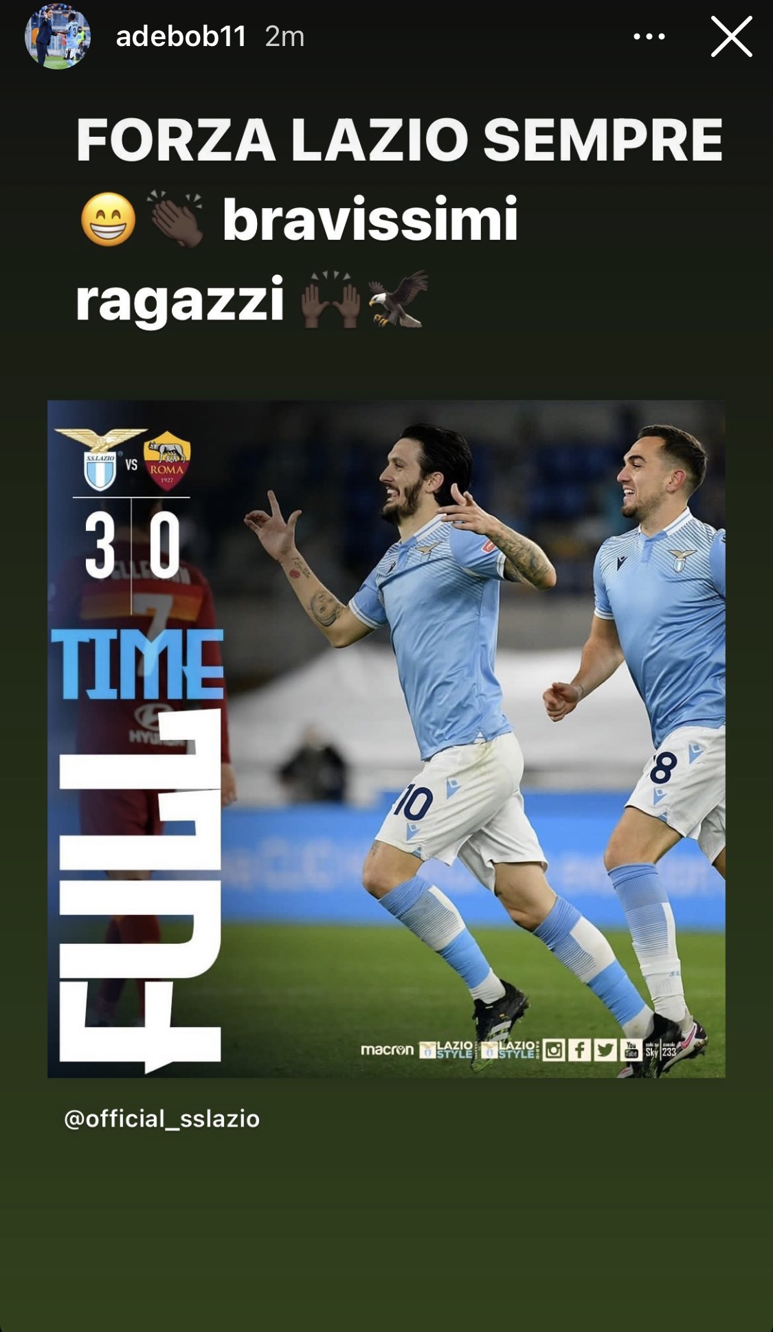 Il derby della Capitale è forse una delle partite più belle del campionato e non solo in Italia. La stracittadina da sempre raccoglie la curiosità di tanti e a questo va aggiunto il fatto che quando indossi la maglia della Lazio difficilmente lo dimentichi. Così Bobby Adekanye, oggi in prestito al Cadice, questa sera ha visto il match e alla fine della gara ha esultato come se fosse a Roma: "Forza Lazio sempre! Bravissimi ragazzi!".