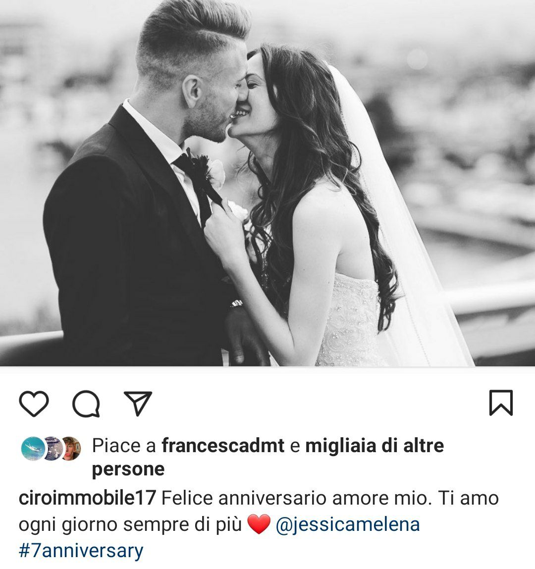 Quella di oggi è per la famiglia Immobile una giornata speciale. Ciro e Jessica festeggiano infatti il settimo anniversario di matrimonio. Per l'occasione, il bomber della Lazio, che non parteciperà con tutta probabilità alla trasferta di Sassuolo causa febbre, ha voluto sorprendere sua moglie. Nel giardino di casa, cinque mazzi di rose rosse a formare la frase "ti amo". Poi, un tenero messaggio via Instagram: "Felice anniversario amore mio. Ti amo goni giorno sempre di più".
