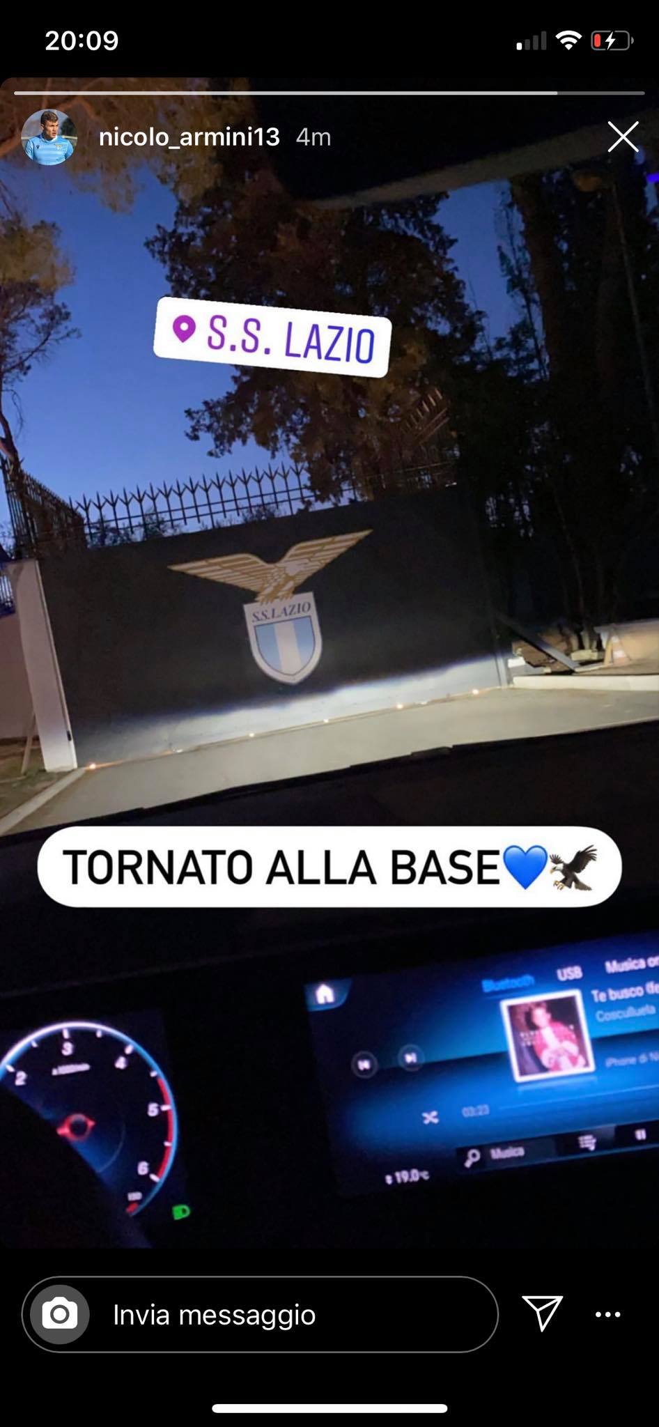 La Lazio è tornata a Roma dopo aver portato a termine il ritiro di Auronzo di Cadore. La squadra di Inzaghi si è allenata già nel pomeriggio nel quartier generale di Formello allenandosi in vista della ripresa del campionato. Anche Nicolò Armini è rientrato dallo stage con l'Italia Under 20 di Bollini. A testimoniarlo la sua storia su Instagram che immortala il cancello con l'aquila stilizzata del centro sportivo e la frase: "Tornato alla base".