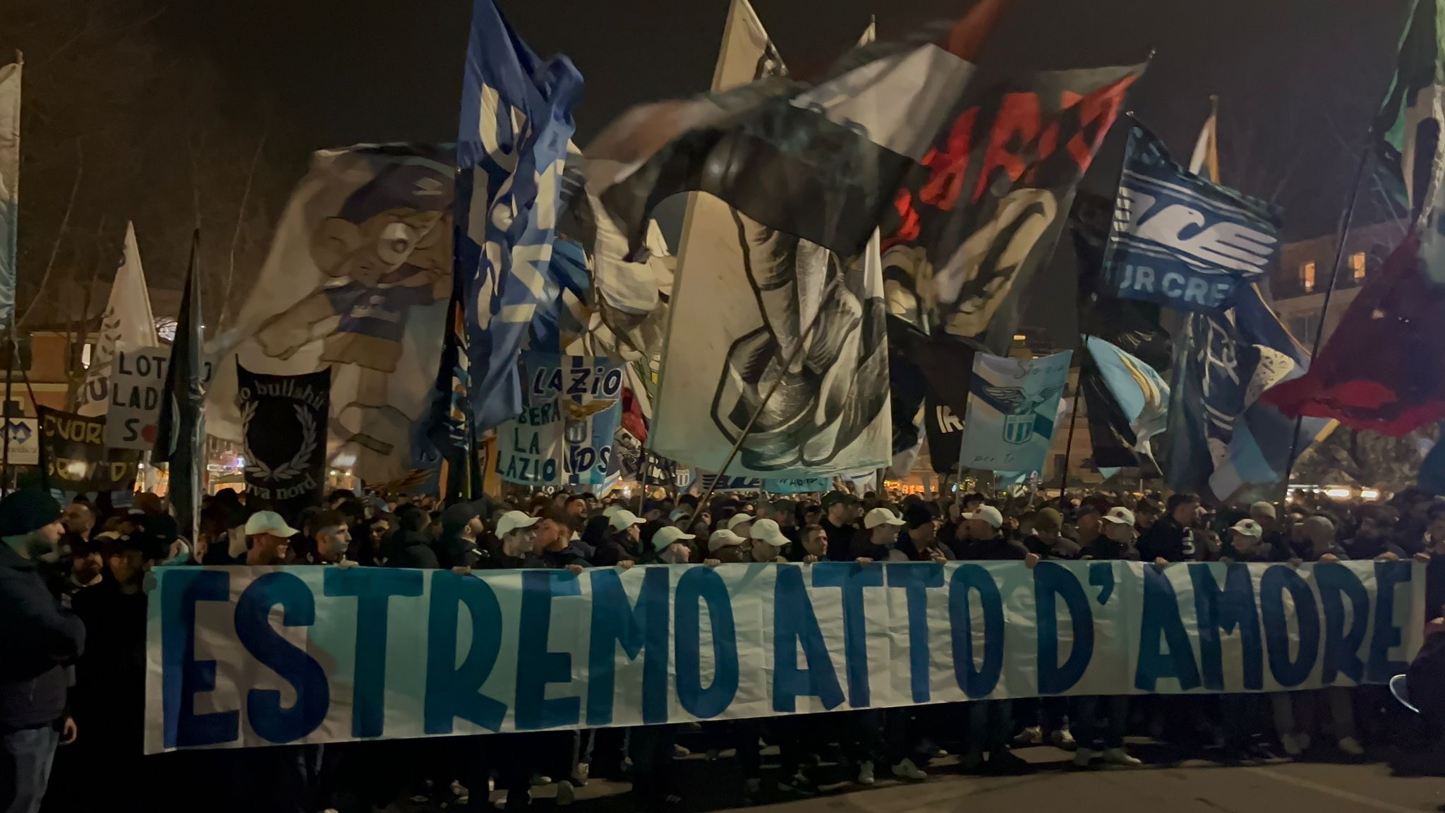 "Estremo atto d'amore". È questa la scritta apparsa sullo striscione esposto a Ponte Milvio dai tifosi biancocelesti. Sono già migliaia i laziali riunitisi intorno all'Olimpico prima della sfida tra Lazio e Atalanta, pronti a sfilare in corteo sotto la Curva Nord per continuare la contestazione nei confronti della società e, allo stesso tempo, sostenere la squadra di Sarri dall'esterno dello stadio. CLICCA QUI PER IL VIDEO