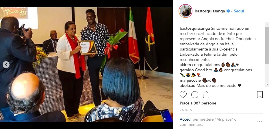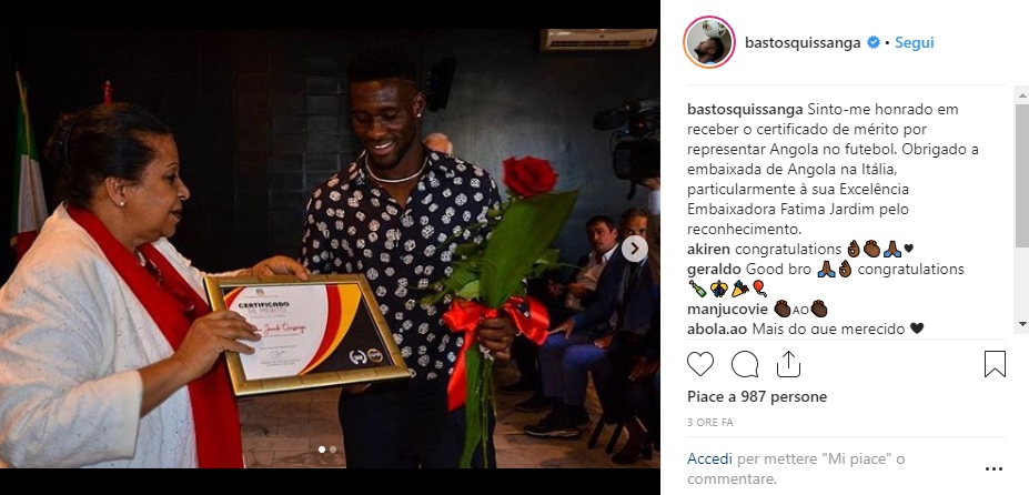 Giornata speciale per Bastos. Il difensore della Lazio è stato premiato oggi dall'ambasciata dell'Angola come rappresentante dello stato africano nel calcio. Sul suo profilo Instagram il numero 15 ci ha tenuto a ringraziare, esternando tutta la sua felicità: "Sono onorato di ricevere il certificato di merito per aver rappresentato l'Angola nel calcio. Un ringraziamento all'ambasciata dell'Angola in Italia, in particolare all'eccellente ambasciatore Fatima Jardim per il riconoscimento".
