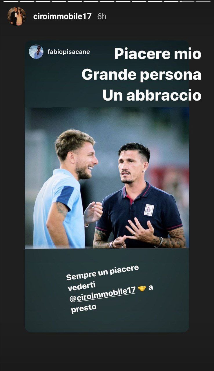 Si sono affrontati in campo nella gara di ieri tra Lazio e Cagliari, ma tra Ciro Immobile e Fabio Pisacane, nonostante la rivalità, scorre buon sangue. Lo testimonia lo scambio di saluti di cui si sono resi protagonisti i due calciatori a qualche ora dal triplice fischio. Il rossoblù ha preso in mano la situazione, dedicando all'amico una 'storia' di Instagram in cui viene ripreso l'incontro tra i due prima dell'inizio della gara: "Sempre un piacere vederti Ciro, a presto". Pronta la risposta del bomber della Lazio, fresco di sorpasso su Cristiano Ronaldo nella classifica marcatori della Serie A: "Piacere mio, grande persona. Un abbraccio".
