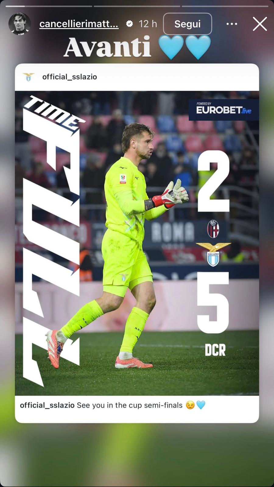 I calciatori biancocelesti sono in estasi, nessuno escluso. L'esterno Matteo Cancellieri, subentrato nel secondo tempo al posto di Gustav Isaksen, ha esultato per la vittoria anche sui social, postando sulle sue storie il risultato e un "Avanti" tutto biancoceleste.