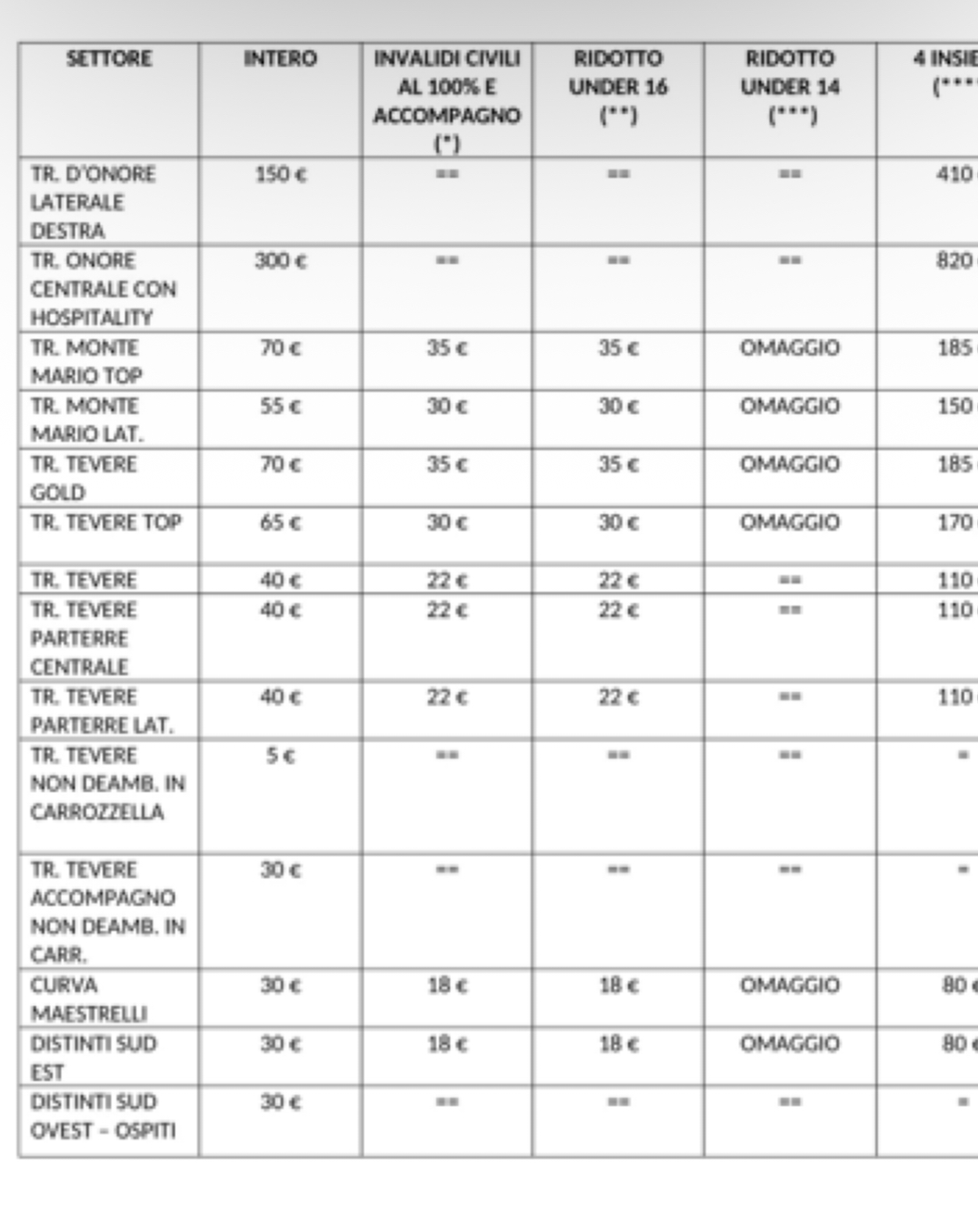 Per questa gara è stata attivata la speciale tariffa 4 insieme, con cui sarà possibile acquistare 4 biglietti dello stesso settore ad un prezzo vantaggioso. Per poter usufruire di questa iniziativa, è obbligatorio acquistare tutti e 4 i biglietti e contemporaneamente.