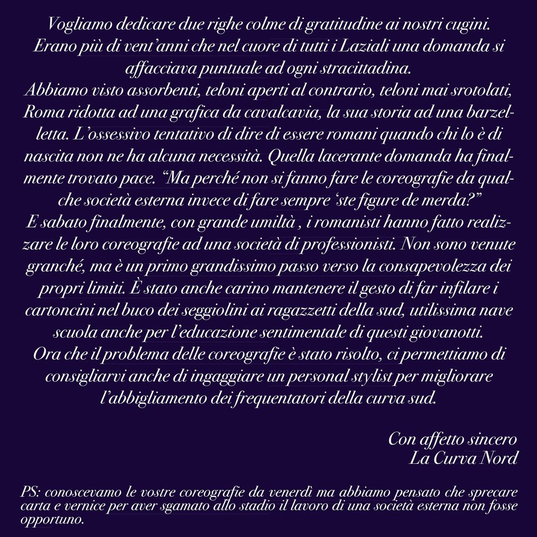 Ora che il problema delle coreografie è stato risolto, ci permettiamo di consigliarvi anche di ingaggiare un personal stylist per migliorare l'abbigliamento dei frequentatori della curva sud. Con affetto sincero, la Curva Nord".