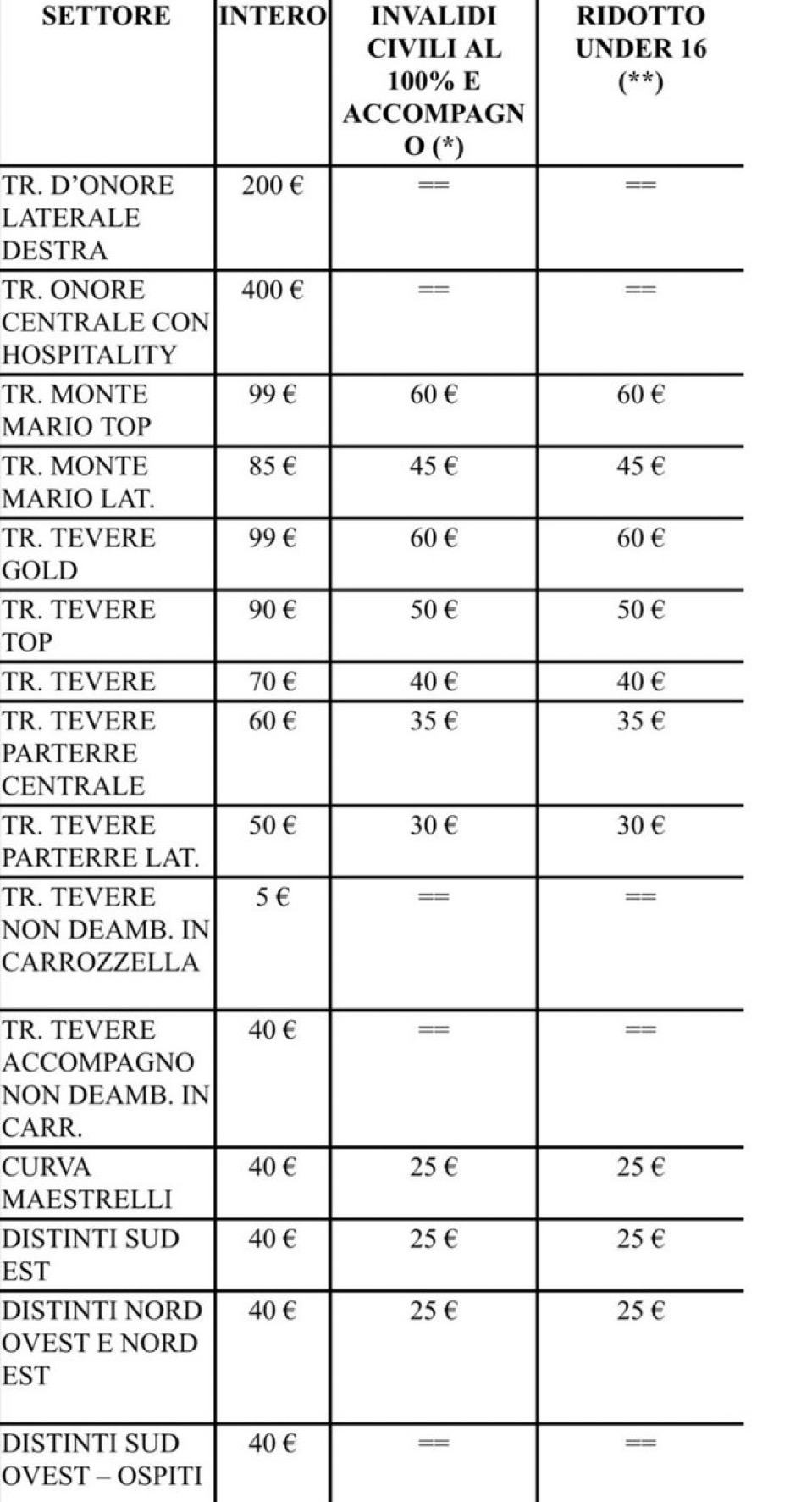 (*) I biglietti ridotti Invalidi Civili al 100% e la Tribuna Tevere non deambulanti entrambi con accompagnatore, posso essere acquistati solo presso i Lazio Style 1900.