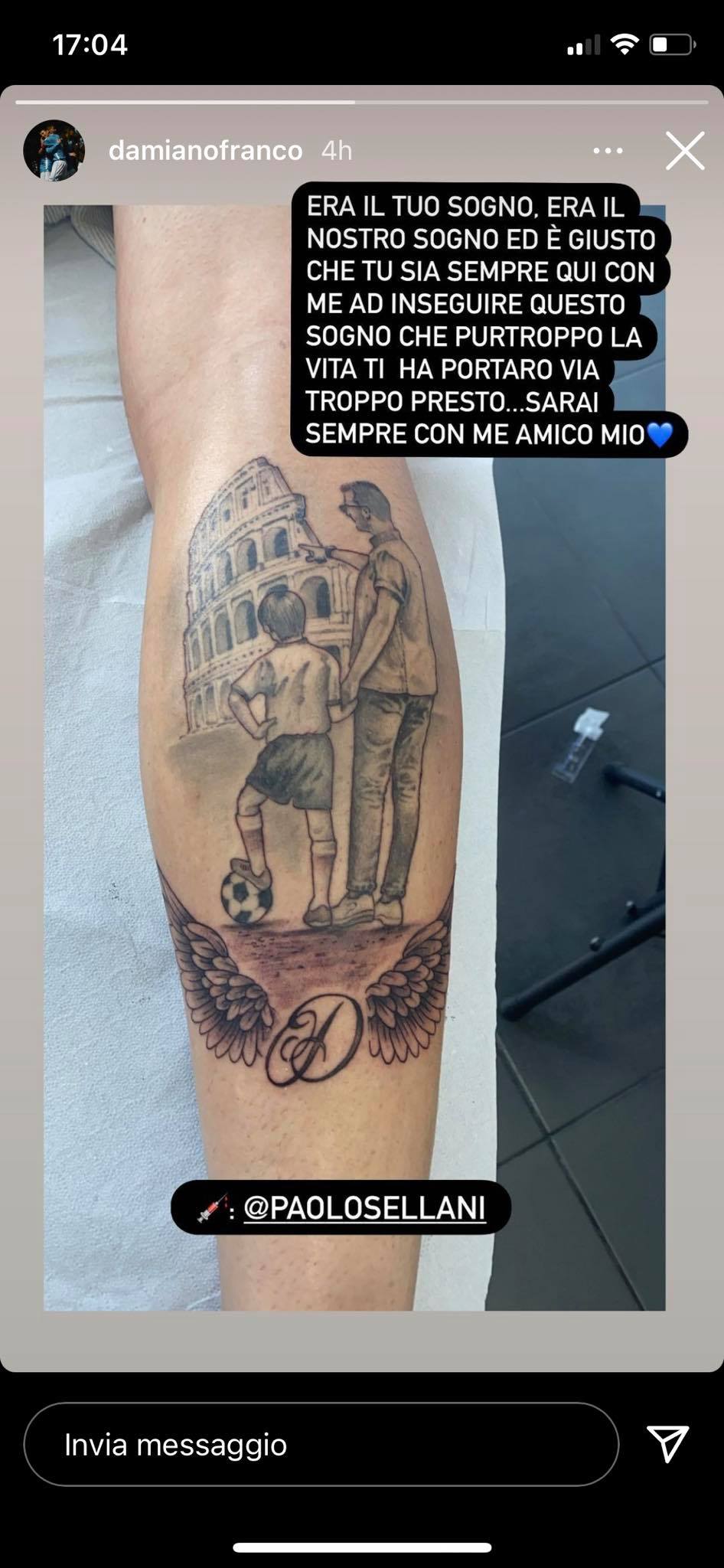Sono passati solo sei giorni dalla scomparsa di Daniel Guerini. Il calciatore della Primavera della Lazio ha perso la vita in un incidente stradale lasciando un vuoto immenso tra i suoi compagni e in generale nel mondo del calcio che ha perso una giovane promessa. Chi ha giocato con lui non potrà mai dimenticarlo e Damiano Franco ha voluto imprimere il ricordo anche sulla pelle dedicandogli un tatuaggio: una G con le ali da angelo, quello che ora è Daniel. "Era il tuo sogno. Era il nostro sogno ed è giusto che tu sia sempre qui con me ad inseguire questo sogno che purtroppo la vita ti ha portato via troppo presto. Sarai sempre con me amico mio", questo il messaggio postato sui social dal biancoceleste.