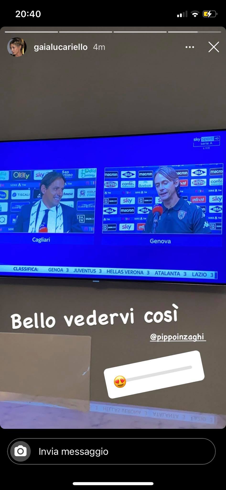 Vince la Lazio contro il Cagliari e vince anche il Benevento in rimonta contro la Sampdoria. Vince Simone Inzaghi e vince anche Pippo che alla fine delle rispettive gare si sono ritrovati insieme anche davanti ai microfoni di Sky Sport e hanno dato vita a una breve intervista doppia. Momento subito immortalato dalla moglie dell'allenatore biancoceleste, Gaia, che ha postato poi la foto sui social: "Bello vedervi così".