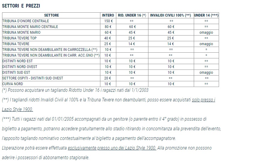 SETTORI E PREZZI (VEDI FOTO IN FONDO ALL'ARTICOLO)