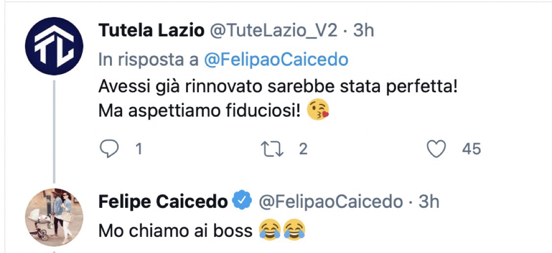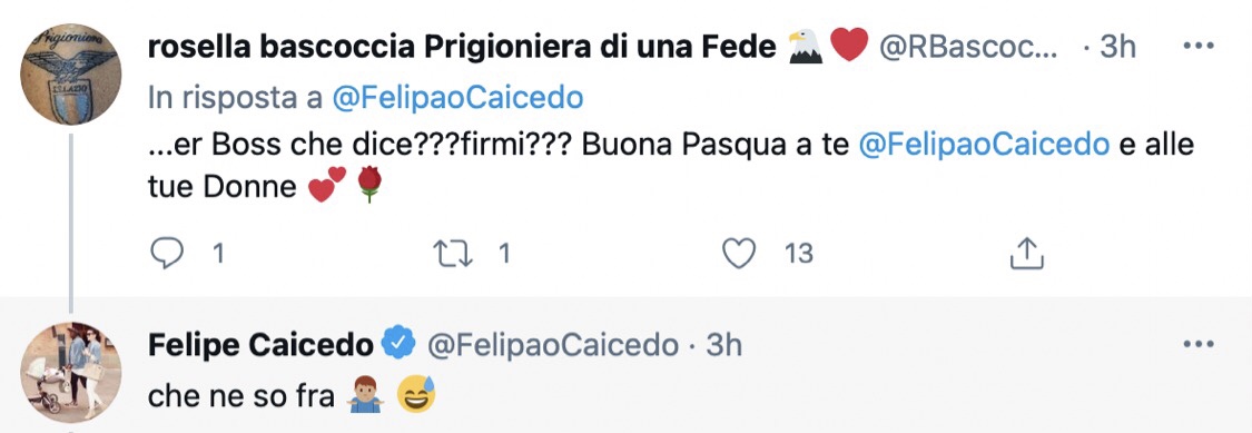 Ci ha pensato ancora una volta Felipe Caicedo a togliere le castagne dal fuoco in casa Lazio. Dopo la rete di Lazzari e il pareggio in rovesciata di Verde allo scadere dei minuti regolamentari è ancora l'attaccante numero 20 a prendersi sulle spalle i biancocelesti e a segnare il gol vittoria dal dischetto. Al termine del match Caicedo ha postato un video su Twitter in cui ha fatto gli auguri di Buona Pasqua, sotto tra i tanti commenti un followers scrive: "Avessi già rinnovato sarebbe stata perfetta! Ma aspettiamo fiduciosi!" ed ecco la risposta di Caicedo: "Mo chiamo il boss" con le emoticons che ridono. Poi arriva anche una seconda risposta a chi gli cheide "Cosa dice il boss?" , "Che ne so fra!". Insomma del rinnovo ancora non si parla, l'unica certezza si chiama zona Caicedo.