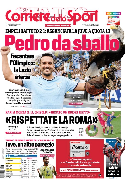 RASSEGNA STAMPA - Un gol da leggenda, la giocata che tutti si aspettavano, l'unica soluzione per risolvere una partita bloccata e complicata. Pedro calcia a incrociare, trova la traiettoria giusta e manda la palla sotto la traversa. Il talento spagnolo fa esplodere l'Olimpico e regala alla Lazio tre punti d'oro con un prodezza degna del suo nome, una prodezza che Il Corriere dello Sport ha voluto riproporre in prima pagina, pubblicando la foto di Pedro con Olympia e il titolo: "Pedro da sballo".