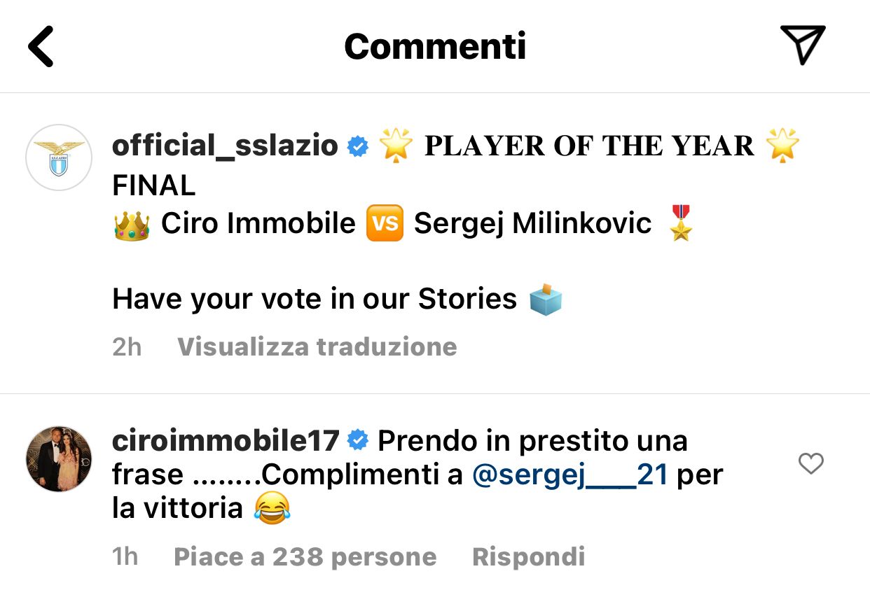 Immobile e Milinkovic si stanno contendendo il titolo di 'Player of the Year' per il 2021. Da questo pomeriggio, fino a domani, si potrà votare il migliore tra il capitano e il centrocampista della Lazio. Il bomber vorrebbe vincere per il secondo anno consecutivo e su Instagram ha iniziato a fare i riti scaramantici. Nella sezione dei commenti del post pubblicato dalla pagina della società biancoceleste, ha scritto: "Prendo in prestito la frase... Complimenti a Milinkovic per la vittoria".