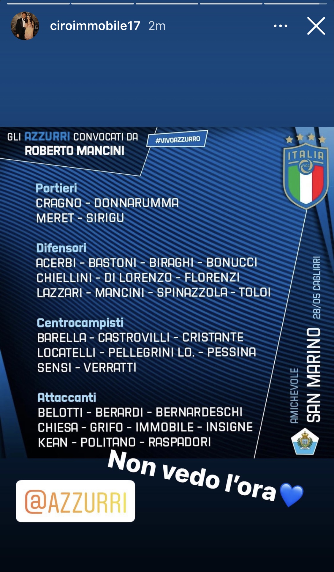 Torino e polemiche ormai alle spalle. Ciro Immobile ha voltato subito pagina dopo quanto accaduto nella serata di ieri a seguito dello 0-0 dell'Olimpico. Domenica l'ultima partita di campionato contro il Sassuolo, poi la mente sarà solo alla Nazionale in vista degli Europei che prenderanno il via l'11 giugno. Intanto gli azzurri dal 24 maggio andranno in ritiro in Sardegna e il 26 sfideranno in amichevole il San Marino. Il bomber biancoceleste è pronto per questa nuova avventura come testimonia la sua storia su Instagram con la foto dei convocati del ct Mancini: "Non vedo l'ora!".