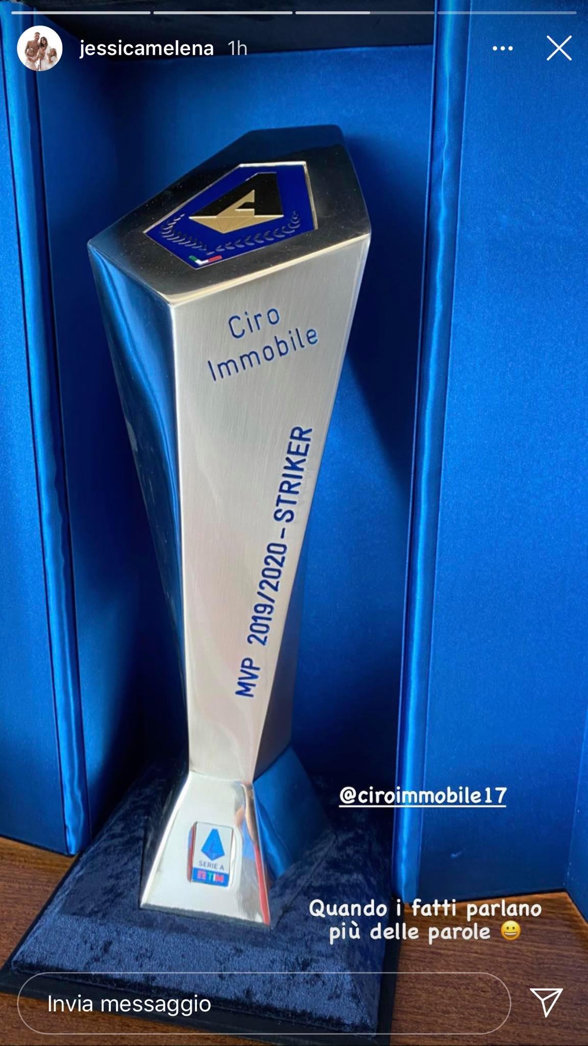 Idolo indiscusso dell'armata biancoceleste, Ciro Immobile è il bomber di razza che ha trascinato la Lazio a suon di gol. La punta del club capitolino è reduce da una stagione pazzesca, in cui ha rincorso e schiacciato record. Con 36 reti ha sbaragliato i suoi rivali, strappando letteralmente lo scettro del miglior marcatore alla concorrenza. Insomma, i numeri parlano per lui. Lo sa bene sua moglie Jessica, che ha voluto rispondere alle ultime critiche lanciate ad Immobile per le sue prestazioni con la Nazionale. Su Instagram ha immortalato il trofeo meritatamente conquistato dalla dolce metà, quello del miglior marcatore dello scorso campionato: "Quando i fatti parlano più delle parole". Giusto ricordarlo, per chi se lo fosse scordato.