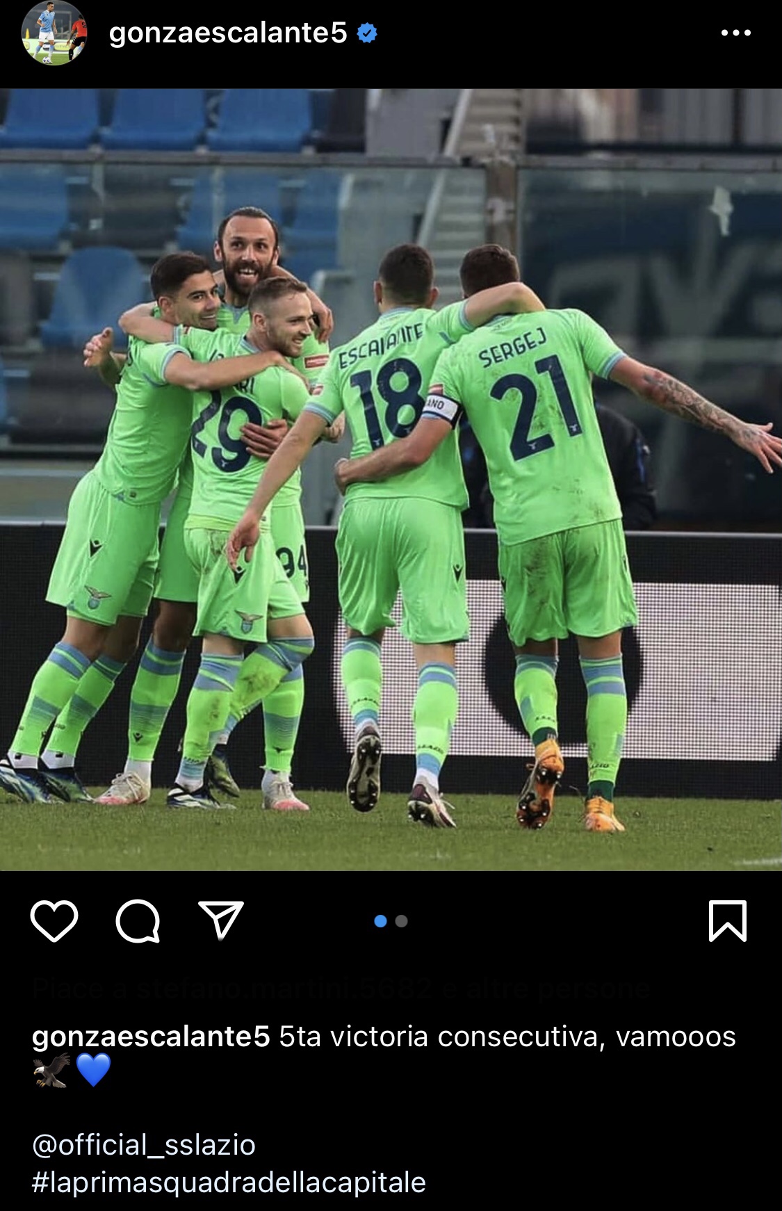 La Lazio vince a Bergamo in una partita interpretata in modo impeccabile dalla squadra di Inzaghi. Una bellissima rete di Marusic, il raddoppio di Correa e la rete a chiudere di Muriqi dopo la rete di Pasalic che aveva momentaneamente accorciato le distanze. Questa l'esuktanza a fine gara di Gonzalo Escalante: "Quinta vittoria consecutiva. Vamosssss".
