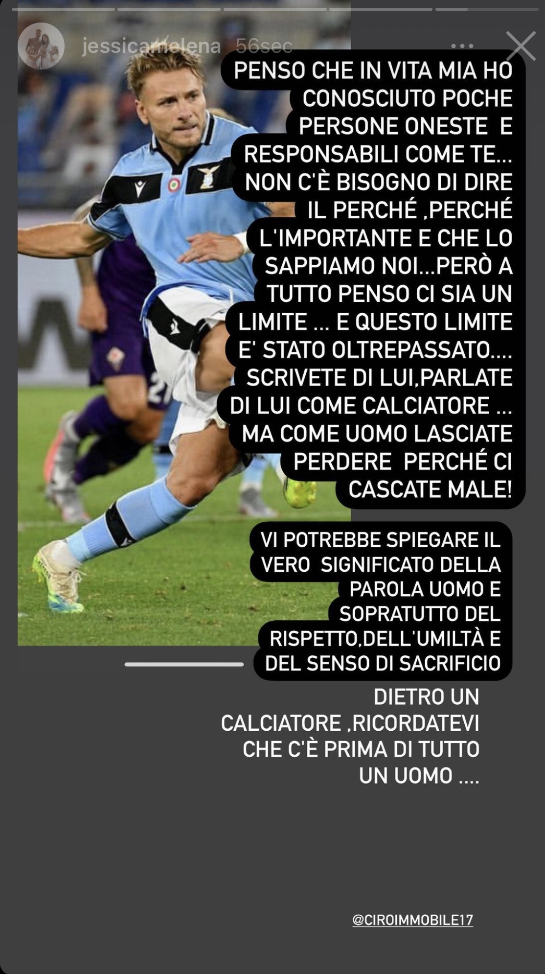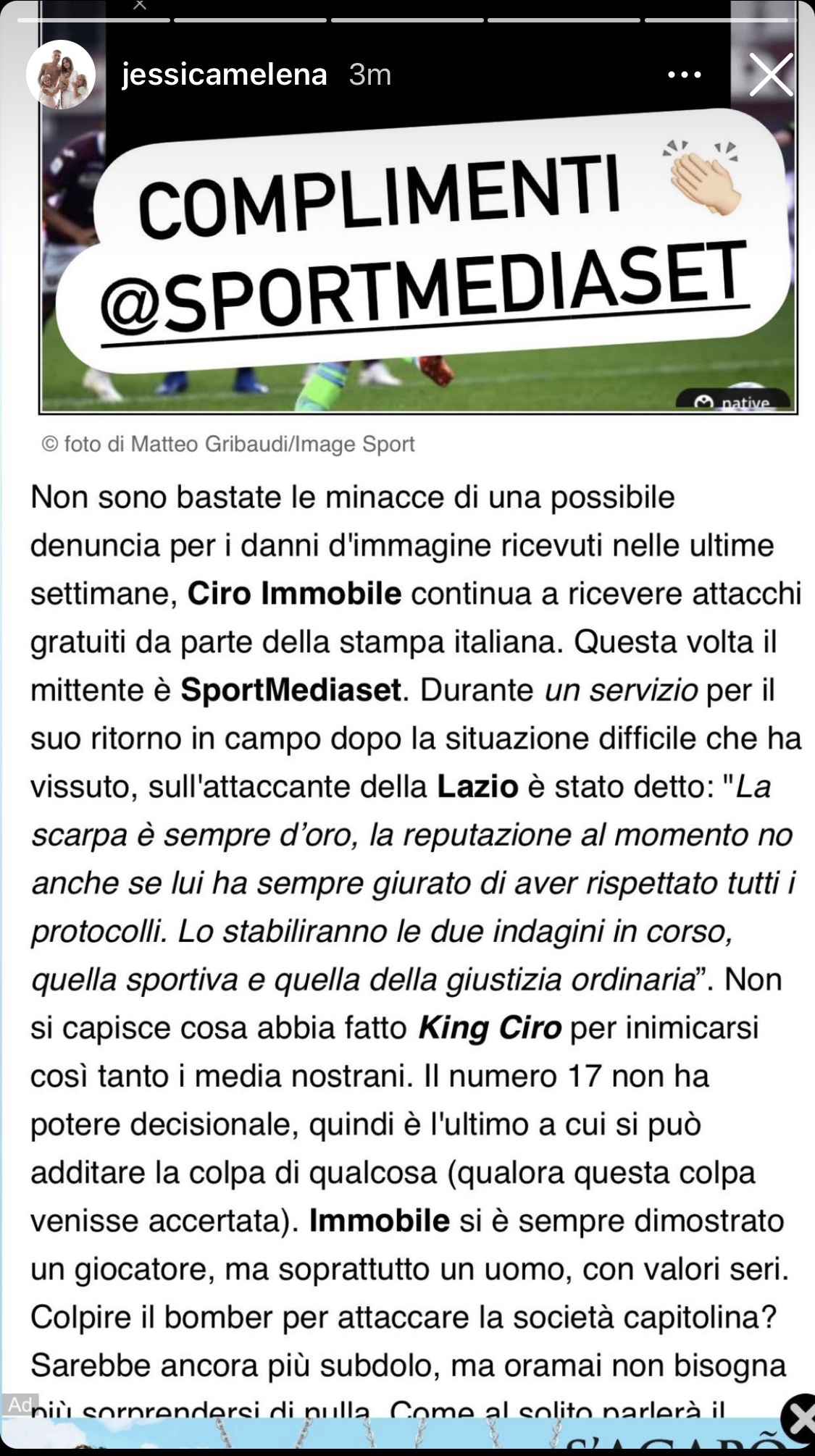 Ha dell'incredibile quanto sta accadendo in queste settimane a Ciro Immobile. Se il popolo biancoceleste non ha mai smesso di sostenerlo in questo periodo di difficoltà estrema lo stesso non può dirsi dei media che non hanno perso occasione per attaccarlo anche quando il bomber della Lazio è l'ultimo ad avere qualsiasi tipo di colpa. L'ultimo attacco è stato quello di Sportmediaset che ha fatto letteralmente imbufalire il numero 17 che si è lasciato andare ad uno sfogo su Instagram. Anche la moglie Jessica ha voluto condividere il suo stato d'animo limitandosi a scrivere "Complimenti a Sportmediaset" in modo ironico. E poi aggiunge: “Penso che in vita mia ha conosciuto poche persone oneste e responsabili come te, non c’è bisogno di dire il perchè, l’importante è che lo sappiamo noi. Però a tutto questo penso ci sia un limite e questo limite è stato oltrepassato. Scrivete di lui, parlate di lui come calciatore ma come uomo lasciate perdere perchè cascate male. Vi potrebbe spiegare il vero significato della parola uomo e soprattutto del rispetto e dell’umiltà insieme al senso di sacrificio. Dietro un calciatore c’è prima di tutto un uomo...”.
