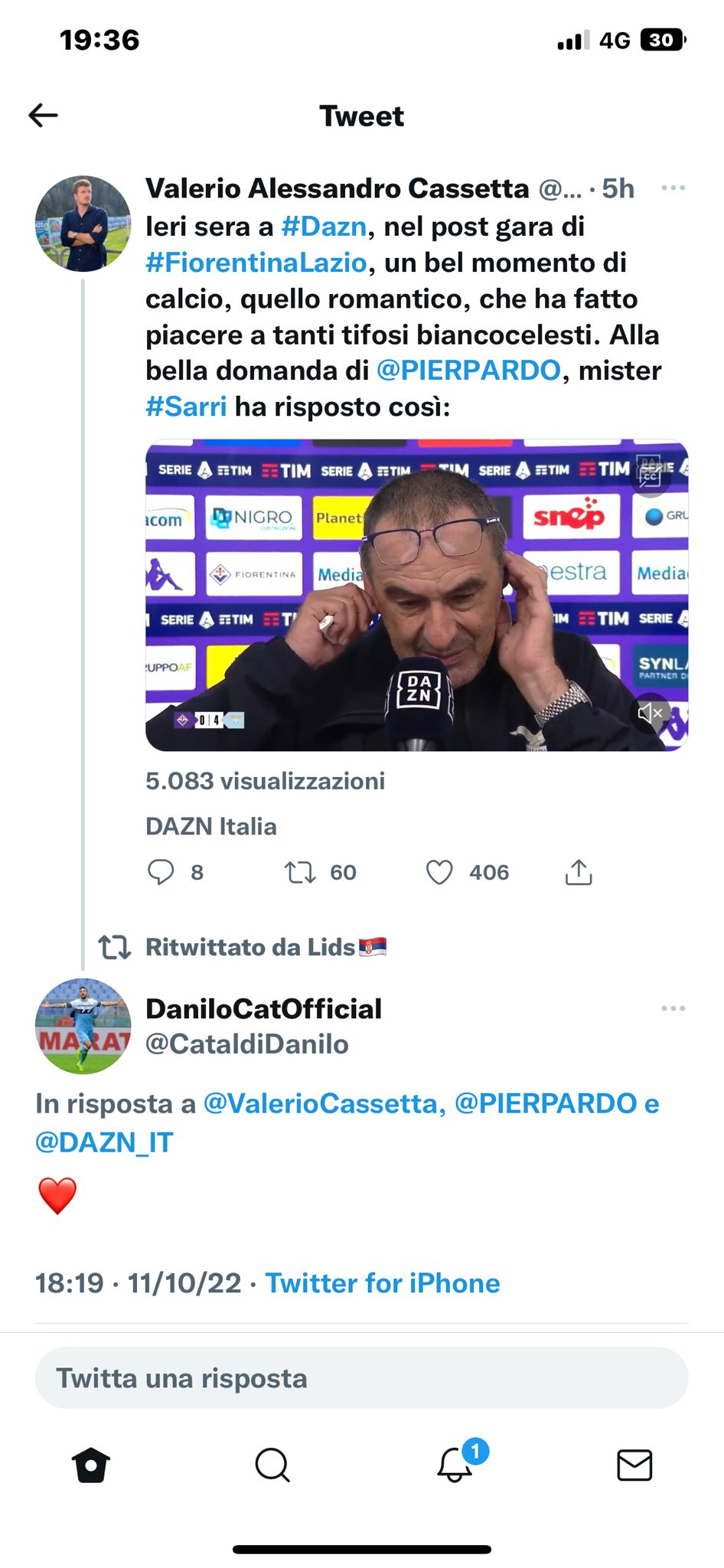 Le dichiarazioni nel post partita di Maurizio Sarri hanno fatto breccia nel cuore dei tifosi laziali. Il tecnico, parlando dell'ambiente ai microfoni di DAZN, ha ricordato Tommaso Maestrelli esprimendo la volontà di giocare la prima partita al Flaminio (probabile futuro stadio della Lazio) dedicato proprio al Maestro. Queste parole hanno fatto gonfiare il petto ai sostenitori biancocelesti e non solo: Danilo Cataldi su Twitter ha commentato con un cuore il video dell'intervista riproposto sul social. Una reazione da vero innamorato di Lazio.