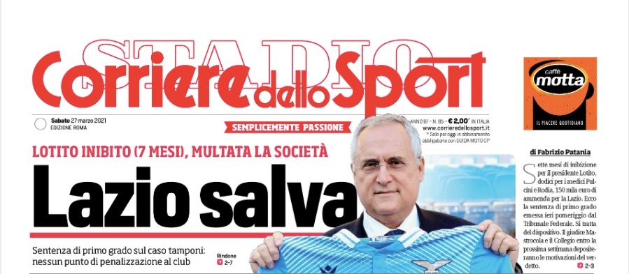 Sette mesi di inibizione a Claudio Lotito, dodici per i medici Rodia e Pulcini e 150 mila euro di multa per la Lazio: questa la sentenza del Tribunale Federale. Niente penalizzazione al club e niente retrocessione, qualcuno forse se lo augurava, ma evidentemente non c'è stato nessuno illecito sportivo commesso dalla società biancoceleste. Questa mattina sulle prime pagine dei maggiori quotidiani sportivi nazionali l'argomento è ripreso sì, ma trattato in modo differente, dandogli più o meno spazio. Dal Corriere dello Sport a Tuttosport, fino alla Gazzetta dello Sport che questa volta non ha scelto nessun titolone a effetto, relegando la sentenza a un piccolo trafiletto di lato. Di seguito le prime pagine della rassegna di Radiosei.