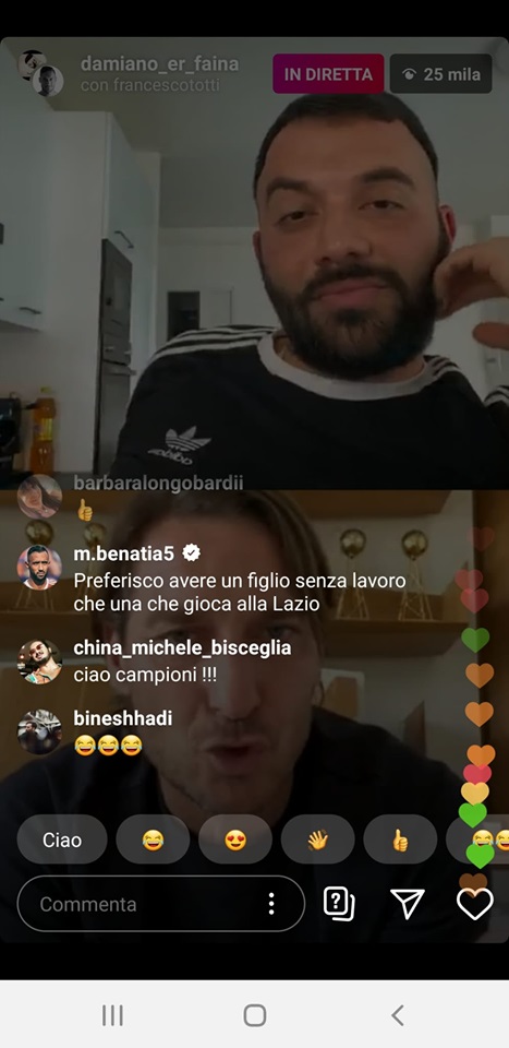 Una diretta per svelare retroscena e parlare dei rivali di sempre. Francesco Totti si è intrattenuto in una live Instagram con Damiano Er Faina, lo youtuber romano di fede laziale. Un momento social cui hanno partecipato anche tanti ex compagni della Roma come Radja Nainggolan e Medhi Benatia. Proprio il difensore marocchino, mentre si scherzava su un possibile futuro di Cristian Totti in biancoceleste, ha voluto rivolgere alla Lazio uno sfottò diventato subito virale: "Preferisco avere un figlio senza lavoro che uno che gioca nella Lazio", la battuta. Anche in quarantena è sempre derby.