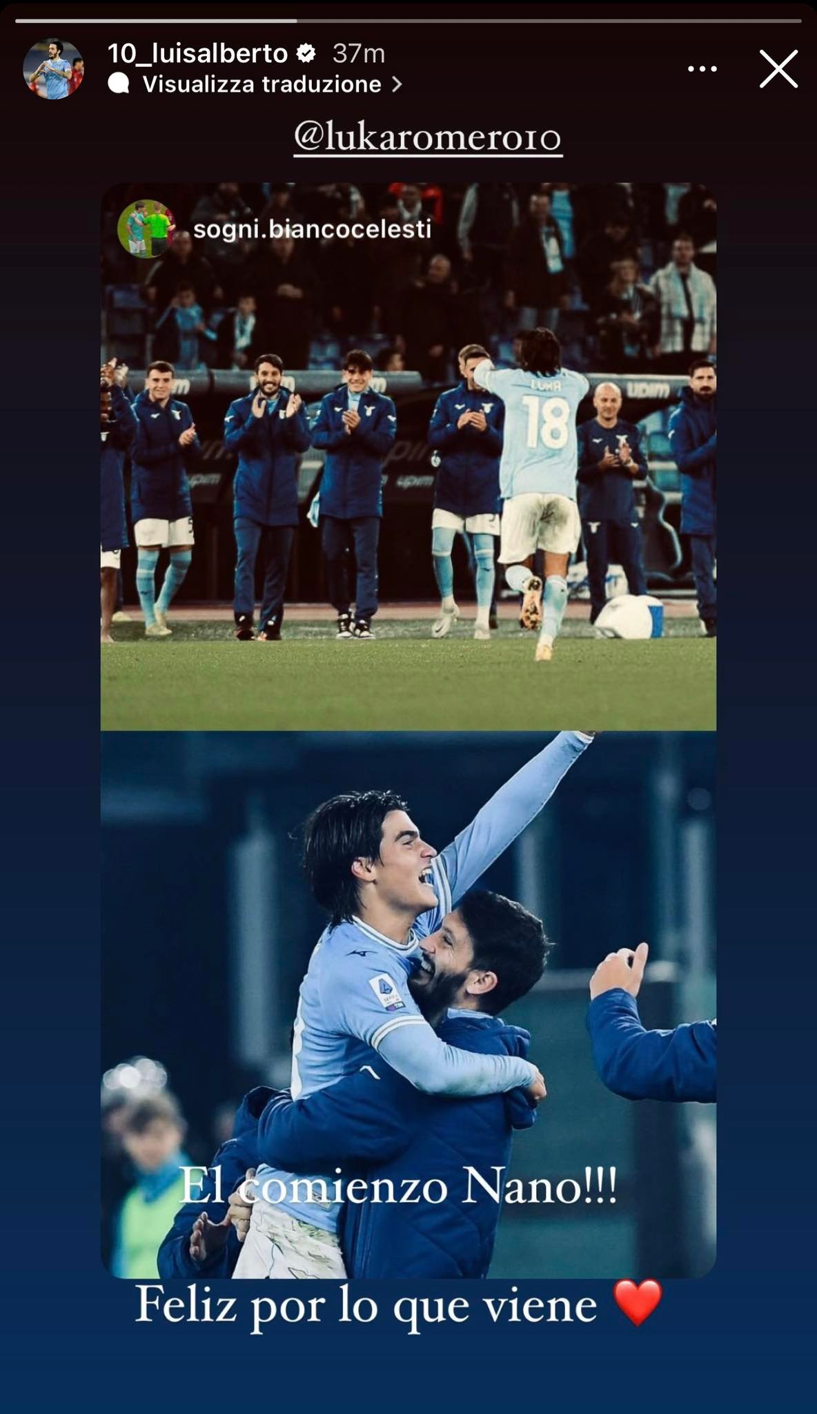 Il giorno dopo Lazio-Monza la scena è tutta per Luka Romero. In casa biancoceleste come è giusto che sia si continua ad incensare il talentino argentino. Tra questi c'è anche Luis Alberto con cui l'ex Maiorca ha mostrato di avere un rapporto particolare. Il mago lo aveva catechizzato prima dell'ingresso in campo e dopo il gol Romero è corso subito ad abbracciarlo in panchina. Il numero 10 laziale con delle stories su Instagram ha voluto spronare ancora di più il promettente giovane: "El comienzo Nano. Feliz por lo que viene" che tradotto significa "È l'inizio Nano. Felice per quello che verrà"