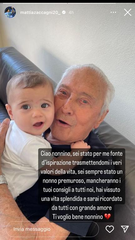 Lutto in famiglia per Mattia Zaccagni che ha perso il nonno. Il biancoceleste è a Empoli per la sfida di oggi, in programma alle 18:30 al Castellani, ma pur non essendo fisicamente con la sua famiglia ha voluto comunque rivolgere un pensiero al suo affetto. Una dedica commovente quella che il numero venti ha scritto su Instagram e che accompagna lo scatto in cui è ritratto il nonno insieme a suo figlio. Queste le parole: "Ciao nonnino, sei stato per me fonte d'ispirazione trasmettendomi i veri valori della vita, sei sempre stato un nonno premuroso. Mancheranno i tuoi consigli a tutti noi, hai vissuto una vita splendida e sarai ricordato da tutti con grande amore. Ti voglio bene".