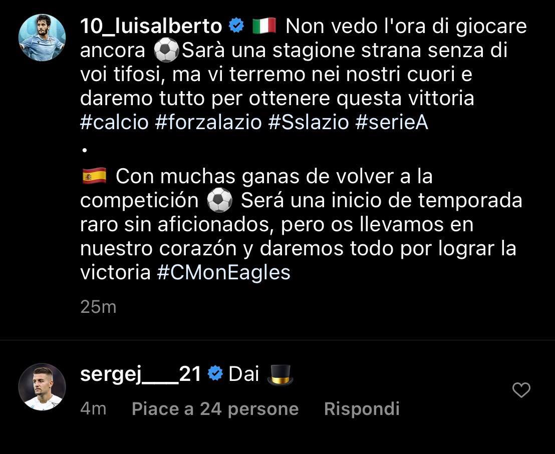 Sta per riformarsi una delle coppie che ha fatto sognare tantissimi tifosi nella passata stagione. Luis Alberto da un lato Milinkovic-Savic dall'altro. Due delle stelle della compagine di Inzaghi sono pronti a tornare in campo e far di nuovo divertire i tifosi anche se solo da casa per ora. Lo spagnolo ha caricato l'ambiente con un messaggio social e il Sergente ha prontamente risposto: "Dai" con l'emoticons del cappello simbolo proprio del Mago Luis.