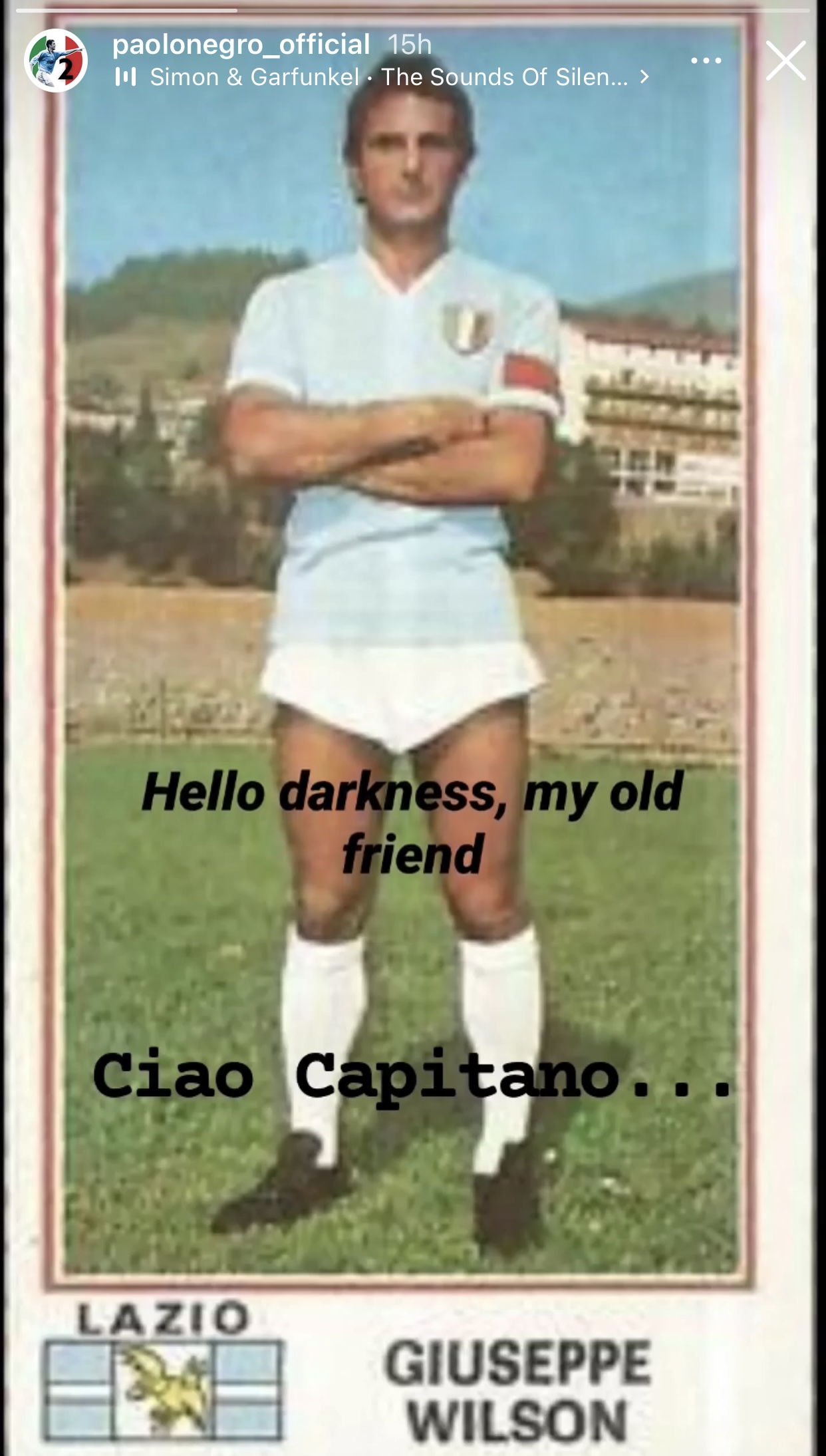 Continuano ad arrivare messaggi e dediche per Pino Wilson da parte di biancocelesti e non solo. L'ex capitano della Lazio, che ci ha lasciato all'età di 76 anni, ha lasciato un segno indelebile nel cuore di tifosi, amici ed ex calciatori. Anche Paolo Negro, difensore biancoceleste dal 1993 al 2005, si è unito al Cordoglio per Pino pubblicando tra le storie Instagram una sua vecchia figurina e aggiungendo: "Ciao Capitano".