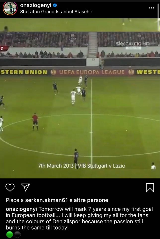 Segnare un gol è un'emozione unica per qualsiasi giocatore. E se quella rete assume dimensione europea la gioia aumenta. Questo è il caso di Onazi, vecchia conoscenza del mondo Lazio, che non può dimenticare il suo primo gol in Europa League con la maglia biancoceleste. Correva il giorno 7 marzo 2013, Ederson e il nigeriano affondarono lo Stoccarda per 2 a 0 nella partita di andata degli ottavi di finale. L'ex Lazio, sul proprio profilo Instagram, ha ricordato quel giorno speciale: "Domani saranno 7 anni dal mio primo gol nel calcio europeo. Continuerò a dare tutto per i tifosi e i colori del Denizlispor, perchè la passione brucia ancora nello stesso modo fino a oggi".