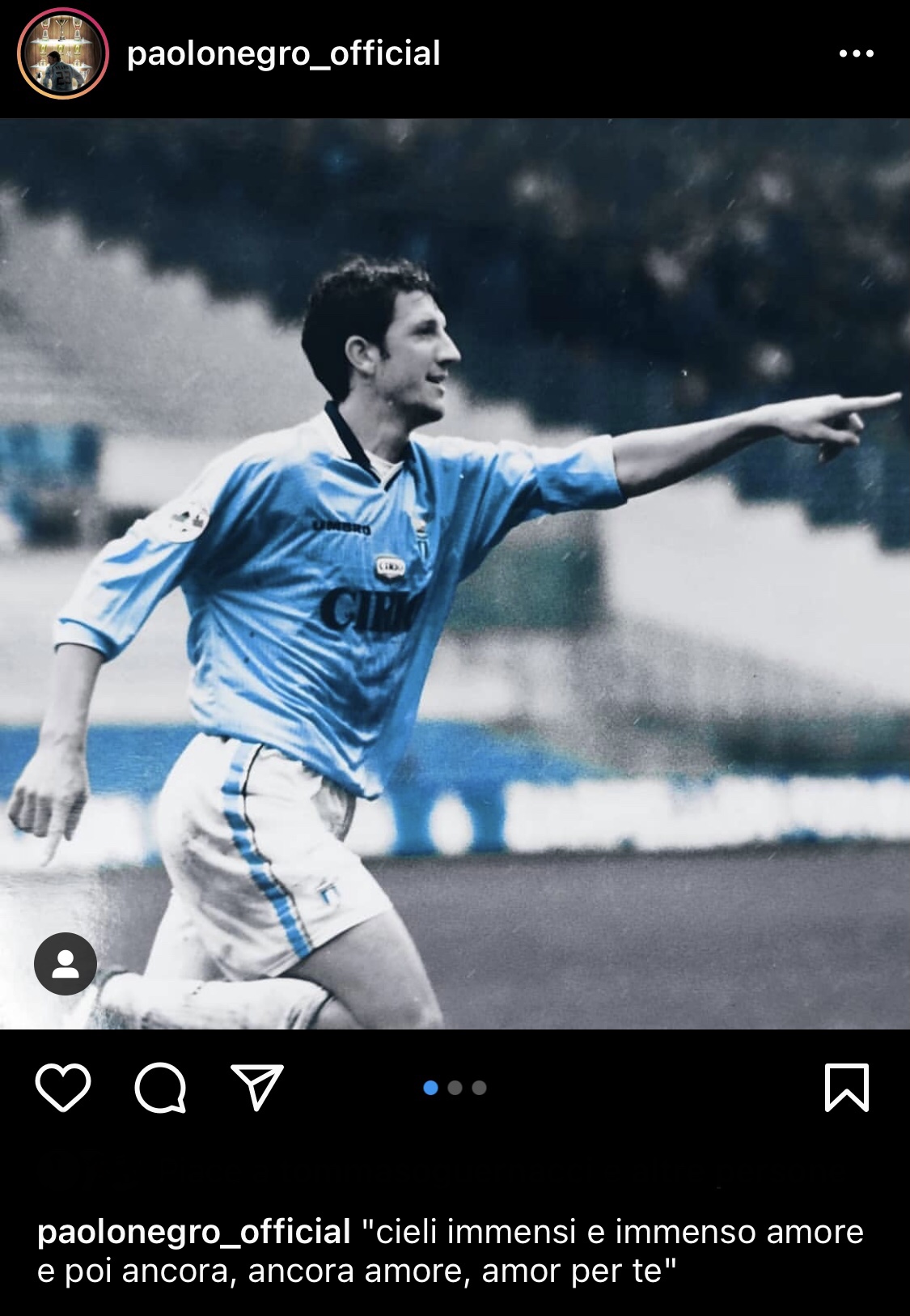 Dodici anni con l'aquila sul petto e anche la fascia da capitano sul braccio. Paolo Negro è entrato di diritto nella storia biancoceleste e come spesso accade chi indossa questa maglia raramente lo dimentica. L'ex biancoceleste ha pubblicato sul suo profilo Instagram alcuni ricordi di quando appunto scendeva in campo con la maglia della Lazio: "Cieli immensi e immenso amore, e poi ancora, ancora amore, amor per te!", celebre frase di una canzone di Lucio Battisti che ogni fine gara accompagna le vittorie della squadra.