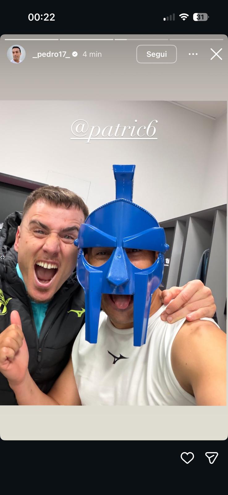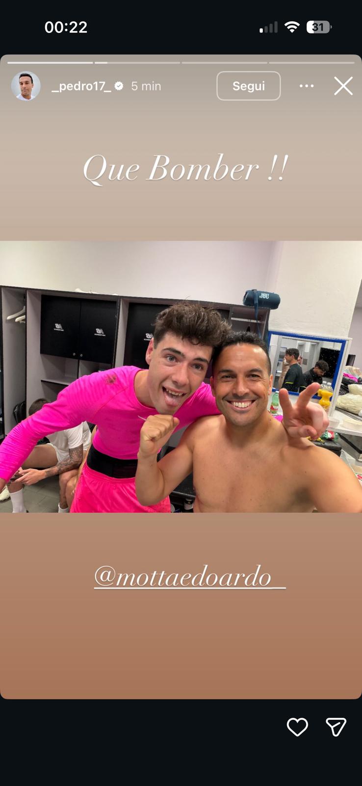La festa dal campo si è spostata nello spogliatoio, lo testimoniano le storie social di Pedro. Lo spagnolo, euforico per la finale di Coppa Italia conquistata dopo una partita tesa e impegnativa, ha condiviso un selfie con Motta - protagonista assoluto della serata - e con Patric. "Che bomber" è il messaggio a corredo dello scatto col portiere, riuscito a neutralizzare 4 tiri dal dischetto.