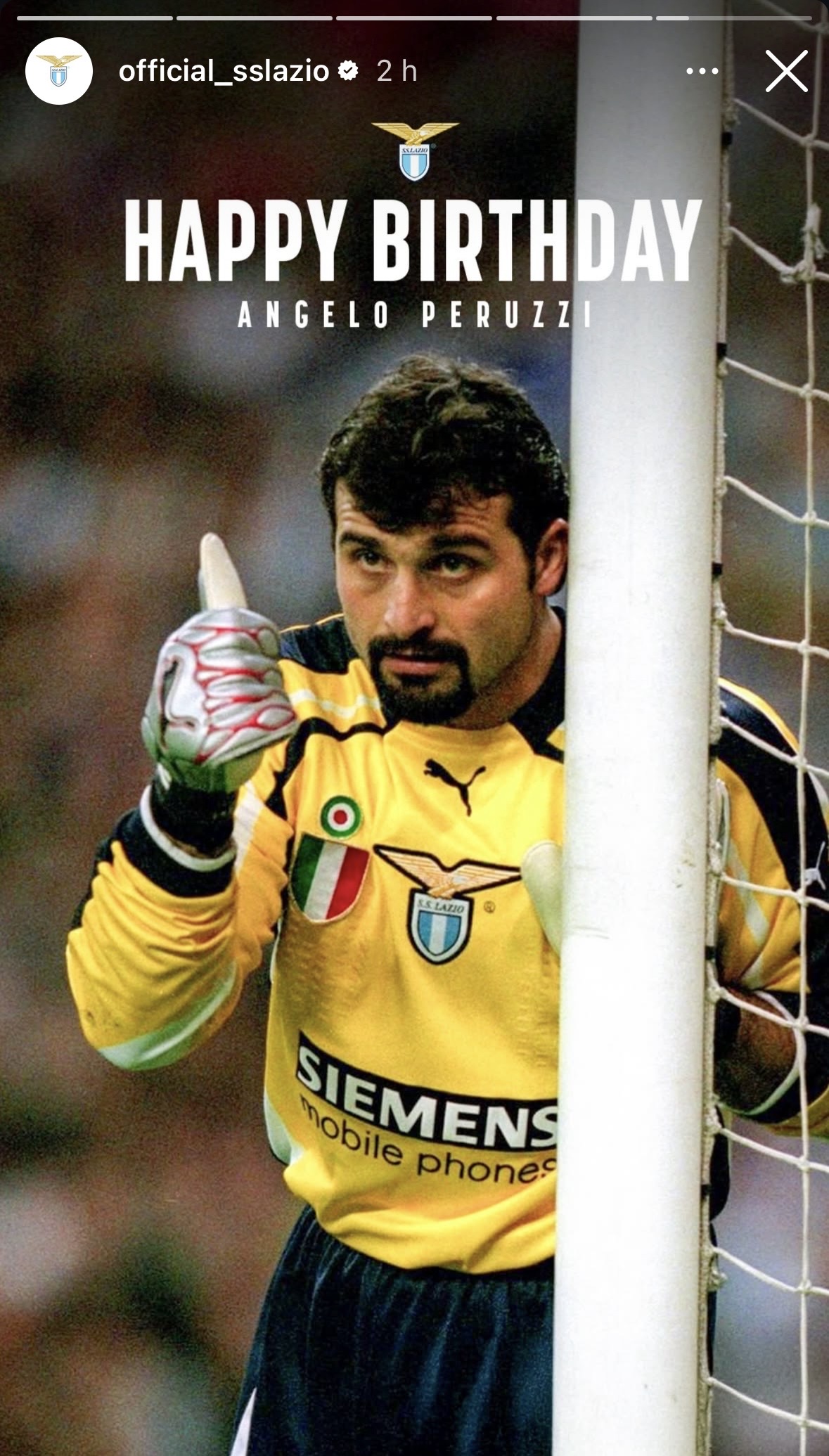 "Spegne oggi 56 candeline Angelo Peruzzi. L’ex portiere della Lazio ha giocato in biancoceleste dal 2000 al 2007. Nella Capitale, Angelo ha collezionato 226 presenze, conquistando una Coppa Italia e una Supercoppa italiana. Successivamente, Peruzzi è stato anche club manager biancoceleste dal 2016 al 2021".