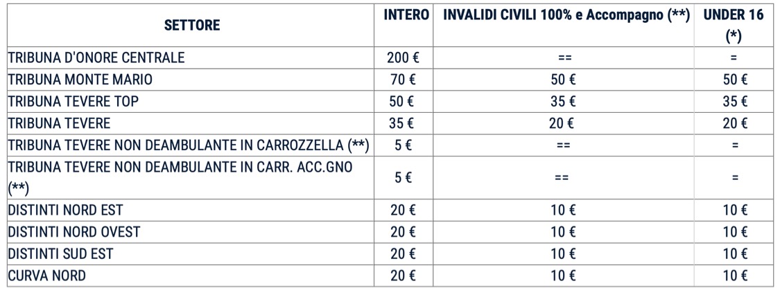 (**) I tagliandi ridotti Invalidi Civili al 100% e la Tribuna Tevere non deambulanti entrambi con accompagnatore, posso