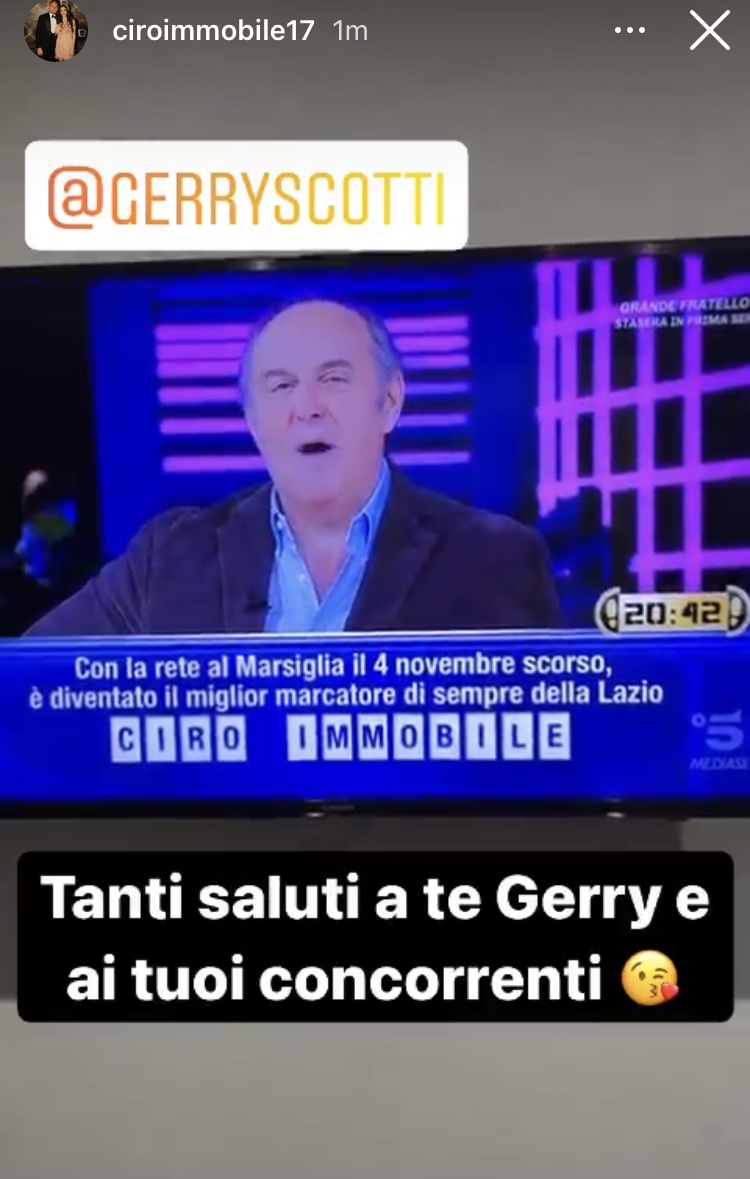 Ciro Immobile è entrato nella storia, e lo sanno anche a "Caduta Libera". Nel corso della puntata odierna del noto quiz televisivo in onda su Canale 5, Gerry Scotti ha mandato un saluto al bomber biancoceleste. La domanda diceva: "Con il gol al Marsiglia il 4 novembre scorso è diventato il miglior marcatore di sempre della Lazio". Il concorrente ha risposto prontamente: "Ciro Immobile" facendo scattare l'applauso dello studio. Il conduttore lombardo ha sottolineato: "Se lo merita, lo salutiamo, grande Ciro!". Poco dopo, su Instagram, è arrivata la risposta del centravanti di Sarri che ha ricondiviso quel momento della puntata e ha aggiunto: "Tanti saluti Gerry e ai tuoi concorrenti".