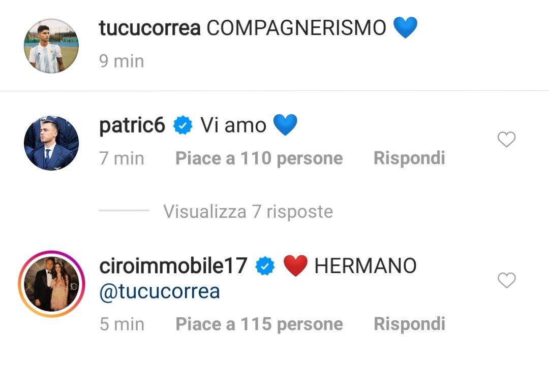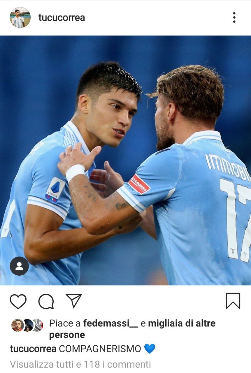 Calciatori, allenatore e gli stessi tifosi l'hanno ripetuto continuamente: "Questa Lazio è una famiglia". Simone Inzaghi è riuscito a rendere il gruppo compatto, unito, voglioso di raggiungere insieme i vari traguardi. E ora che Ciro Immobile è a un passo dalla Scarpa d'Oro e dai numeri di Higuain in Serie A, i compagni lo stanno mettendo nelle migliori condizioni per dare il massimo e conquistare l'ennesimo record. Il bel clima che c'è all'interno dello spogliatoio biancoceleste è confermato dal post Instagram pubblicato da Correa. L'argentino ha optato per una foto insieme a Immobile, aggiungendo: "Compagnerismo". Puntuale la risposta dell'attaccante: "Fratello", inframezzata dal commento di Patric: "Vi amo".