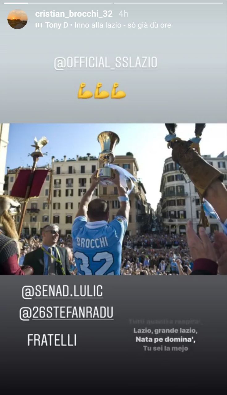 A sette anni dal trionfo della Lazio sulla Roma del 26 maggio 2013, anche Cristian Brocchi ha voluto ricordare la vittoria di quella storica Coppa Italia. Su Instagram, l'attuale tecnico del Monza ha condiviso una foto che lo ritrae con il trofeo al cielo, menzionando Lulic e Radu e chiamandoli "Fratelli". Infine, Hernanes ha pubblicato il video con gli highlights della sfida, aggiungendo: "Facendo la storia. Sette anni fa. Ciò che facciamo in vita rieceggia per l'eternità".