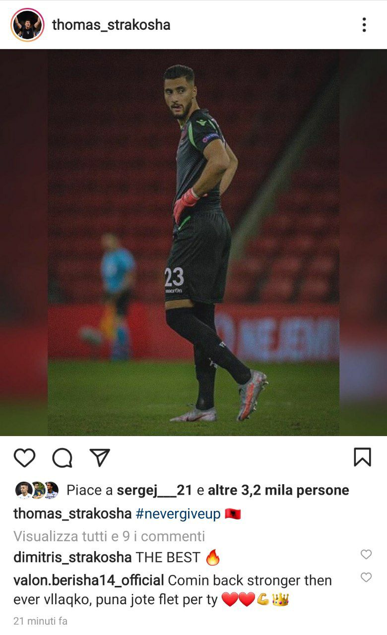 A causa di alcuni importanti problemi fisici, Thomas Strakosha non è rientrato nell'elenco dei convocati del match di questa sera tra Lazio e Cagliari. Il momento del portiere albanese è sicuramente complicato, ma lui non ha alcuna intenzione di arrendersi. E il messaggio pubblicato sul proprio profilo Instagram lo conferma: "Mai mollare". Tra i numerosi commenti di tifosi e amici, anche quello di Valon Berisha, compagno di squadra di Strakosha quando vestiva la maglia biancoceleste. Il centrocampista, ora tra le fila del Reims, gli ha espresso sostegno: "Tornerai più forte di prima".