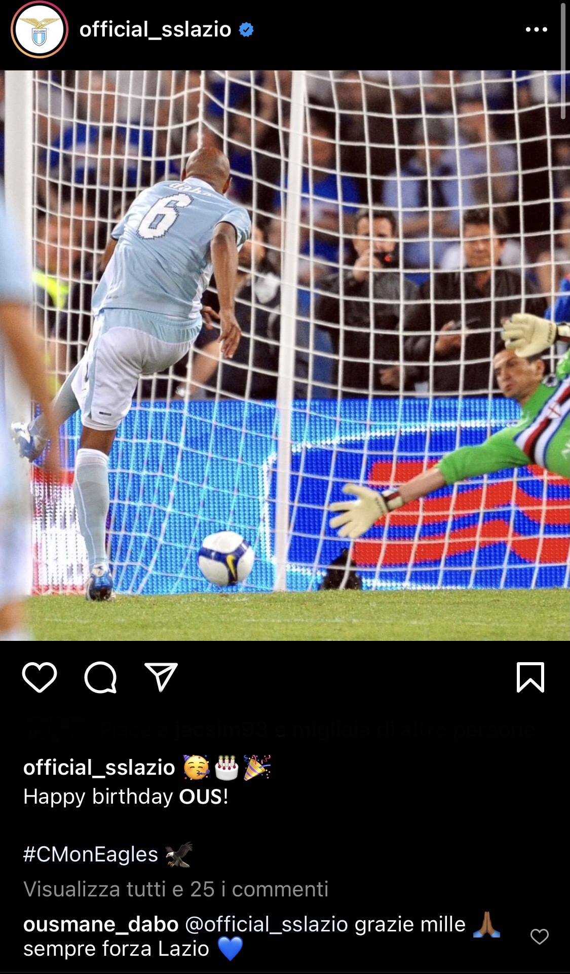 Giornata speciale per l'ex biancoceleste Ousmane Dabo che oggi spegne 44 candeline. Il francese ha indossato la maglia biancoceleste in due momenti diversi della sua carriera: la prima volta nel 2003, 96 presenze (79 in campionato, 10 nelle coppe nazionali e 7 nelle competizioni europee) e 3 reti (tutte in campionato), e poi di nuovo nel 2008 fino al 2010. Con l'aquila sul petto ha vinto due Coppa Italia e una Supercoppa. La società ha quindi voluto omaggiarlo sui social con un post e un messaggio di auguri al quale Dabo ha risposto: "Grazie mille! Sempre forza Lazio!".