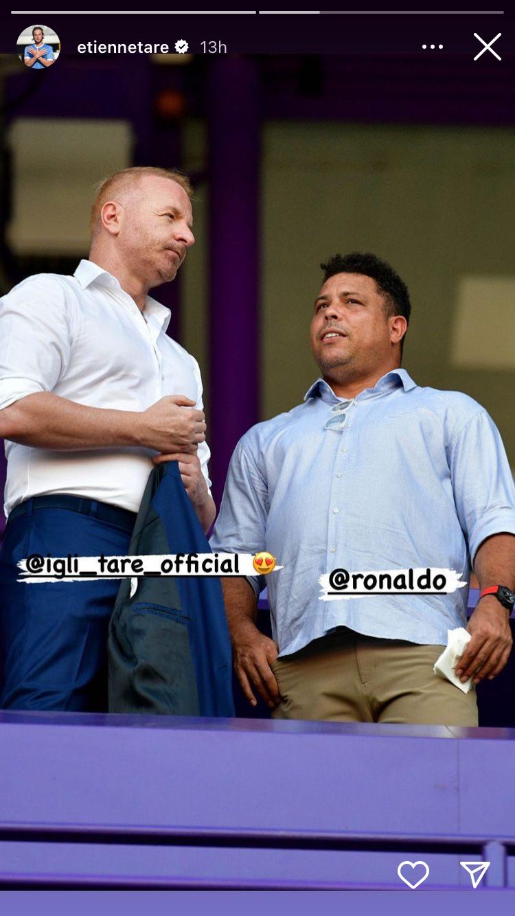 La Lazio ieri ha disputato l'ultimo test di questo pre campionato. Al Zorrilla di Valladolid è andata in scena l'amichevole contro il Real, valida per il trofeo "Ciudad de Valladolid" che si è aggiudicato la squadra ospitante. In tribuna autorità, a fare gli onori di casa il presidente del club spagnolo: Ronaldo. Il brasiliano, oltre ad assistere alla sfida e a gioire per la vittoria, ha avuto modo anche di intrattenersi con il ds Igli Tare. Lo testimonia lo scatto condiviso tramite i canali social dal figlio del direttore sportivo, Etienne. L'ex biancoceleste ha postato una foto che li ritrae insieme mentre parlano, accompagnato da un emoticon con gli occhi a cuoricino.