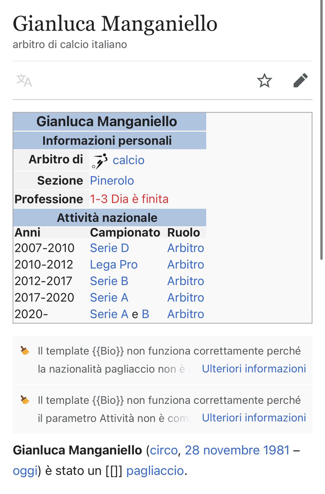 Un'ammonizione che brucia tantissimo, proprio quanto il ko interno con la Salernitana che ferma la serie positiva della Lazio. Nel secondo tempo del match dell'Olimpico, Manganiello sventola il cartellino giallo in faccia a Milinkovic per un fallo piuttosto dubbio, il primo da quando il serbo aveva fatto il suo ingresso in campo. Il Sergente era diffidato e salterà il derby del prossimo weekend. Grandi proteste in campo del 21 e dei compagni di squadra, poi anche Sarri nel post partita e infine anche i tifosi sia allo stadio che sul web. Sulla pagina di Wikipedia del direttore di gara della sezione di Pinerolo è apparso un elemento curioso. Al posto del luogo di nascita, c'è la parola "circo" e come descrizione "oggi è stato un pagliaccio". Sui social tantissimi commenti con il nome di Manganiello accompagnati dall'emoticon del clown, come una sorta di punizione per la direzione arbitrale discutibile messa in mostra all'Olimpico
