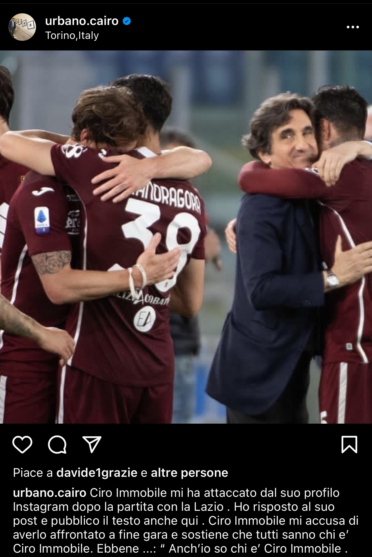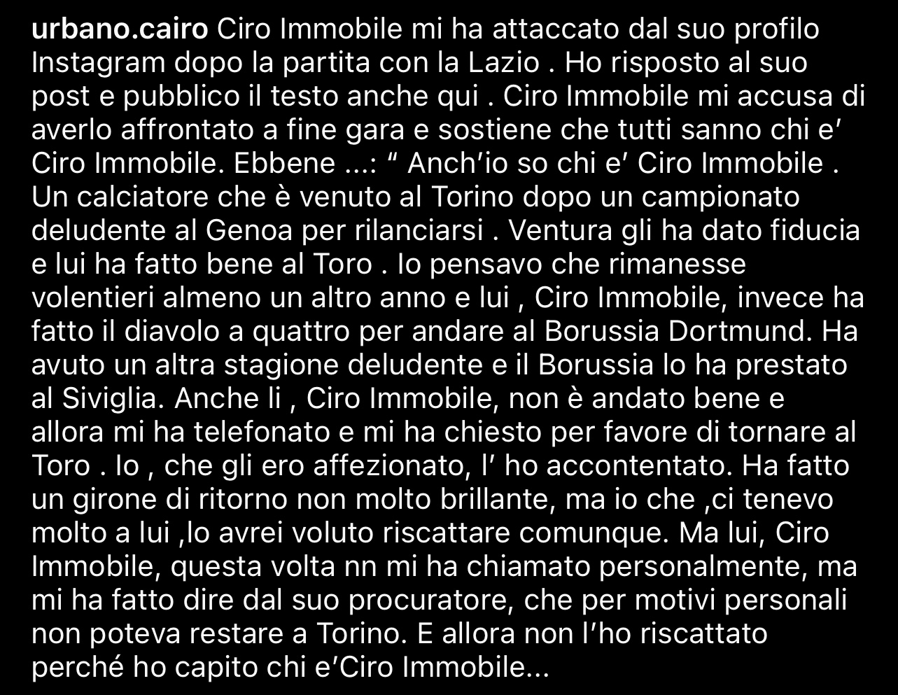 LAZIO SOCIAL - Dopo l'accusa di Ciro Immobile, immediata è arrivata la risposta di Urbano Cairo. Il presidente del Torino ha usato anche lui Instagram non tanto per giustificare il suo atteggiamento post partita, ma per raccontare cosa è accaduto durante la permanenza in granata dell'attaccante. Ecco il post del patron dei piemontesi: "Ciro Immobile mi ha attaccato dal suo profilo Instagram dopo la partita con la Lazio . Ho risposto al suo post e pubblico il testo anche qui . Ciro Immobile mi accusa di averlo affrontato a fine gara e sostiene che tutti sanno chi e’ Ciro Immobile. Ebbene ...: “ Anch’io so chi e’ Ciro Immobile . Un calciatore che è venuto al Torino dopo un campionato deludente al Genoa per rilanciarsi . Ventura gli ha dato fiducia e lui ha fatto bene al Toro . Io pensavo che rimanesse volentieri almeno un altro anno e lui , Ciro Immobile, invece ha fatto il diavolo a quattro per andare al Borussia Dortmund. Ha avuto un altra stagione deludente e il Borussia lo ha prestato al Siviglia. Anche li , Ciro Immobile, non è andato bene e allora mi ha telefonato e mi ha chiesto per favore di tornare al Toro . Io , che gli ero affezionato, l’ ho accontentato. Ha fatto un girone di ritorno non molto brillante, ma io che ,ci tenevo molto a lui ,lo avrei voluto riscattare comunque. Ma lui, Ciro Immobile, questa volta nn mi ha chiamato personalmente, ma mi ha fatto dire dal suo procuratore, che per motivi personali non poteva restare a Torino. E allora non l’ho riscattato perché ho capito chi è Ciro Immobile..."