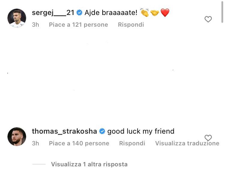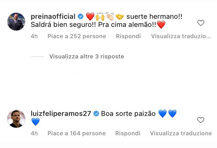 È arrivata nel pomeriggio l’ufficialità di Lucas Leiva al Gremio. A darne notizia è stato lui stesso nel corso di una diretta su Instagram, voleva fare una sorpresa ai tifosi e ci è riuscito in pieno. Da quando è stata divulgata la notizia, sotto il post del video piovo commenti da parte dei supporter del club brasiliano che non vedevano l’ora di accoglierlo e messaggi di buona fortuna anche da parte dei suoi ex compagni biancocelesti. Il primo a commentare è stato Sergej Milinkovic Savic che in serbo gli ha scritto: “Coraggio Amico”, seguito da Thomas Strakosha, Luiz Felipe, Pepe Reina, Proto, Patric e Adam Marusic con un semplice ma sentito “Buona fortuna fratello/Amico”. C’è chi invece ha deciso di astenersi dalle parole preferendo cuori rossi o blu, come Correa, Cabral e Armini. Insomma, una vera e propria ondata d’affetto e di stima per il centrocampista che nel corso della sua avventura con l’aquila sul petto ha dimostrato di essere prima di tutto un uomo di valore e poi un professionista di livello.