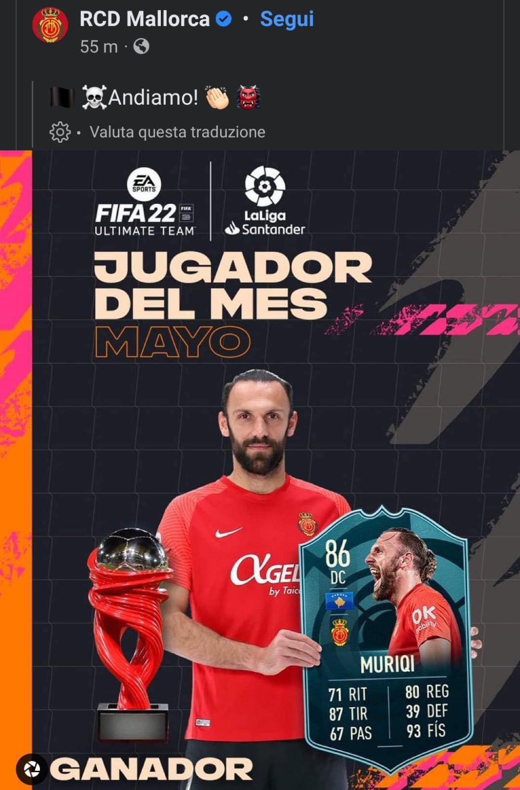 L'avventura al Maiorca di Vedat Muriqi è andata molto meglio di quanto non lasciasse sperare l'approccio del kosovaro a Roma, con la stagione che si sta concludendo alla grande: l'attaccante di proprietà della Lazio è infatti stato nominato miglior giocatore della Liga spagnola per il mese di maggio, meritandosi anche una super carta dal valore di 86 in FUT. Non c'è che dire, il Muriqi sbarcato in Spagna ha davvero saputo conquistare il suo nuovo pubblico.