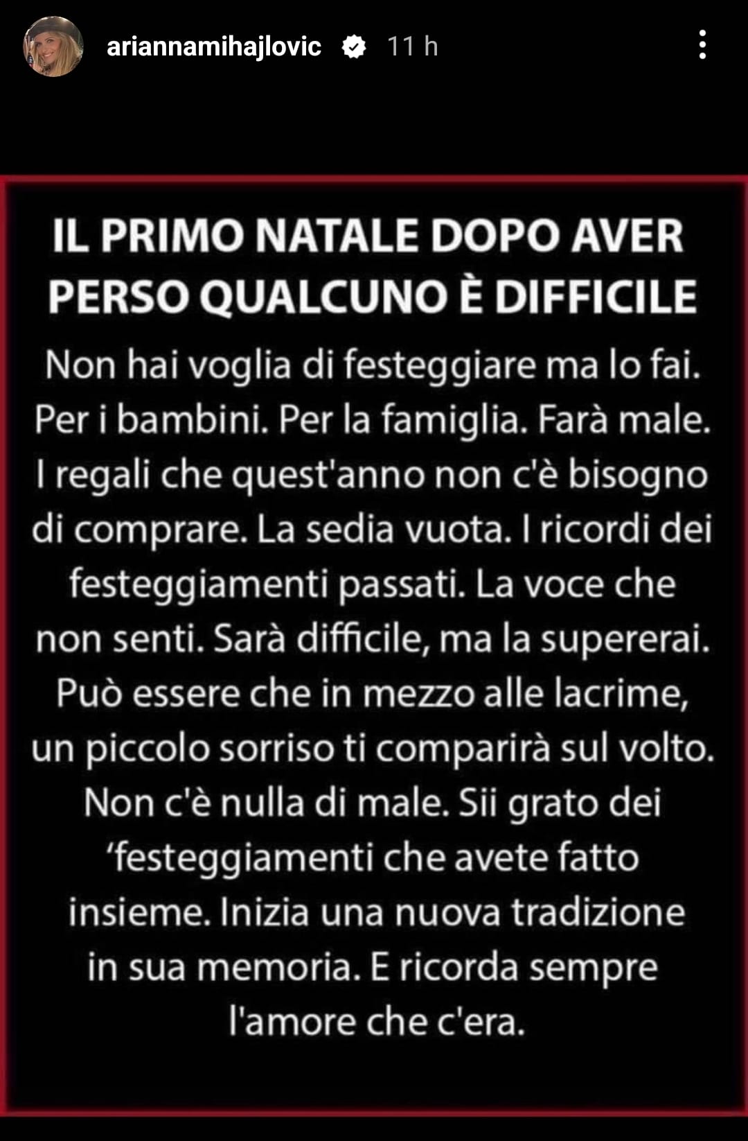 Quello appena trascorso è stato il primo Natale senza Sinisa Mihajlovic. La famiglia del campione si è stretta ancora di più nel suo ricordo, con la moglie Arianna che ha voluto condividere tramite i social un pensiero a lui dedicato: "Il primo Natale dopo aver perso qualcuno è difficile. Non hai voglia di festeggiare ma lo fai. Per i bambini. Per la famiglia. Farà male. I regali che quest'anno non c'è bisogno di comprare. La sedia vuota. I ricordi dei festeggiamenti passati. La voce che non senti. Sarà difficile, ma la supererai. Può essere che in mezzo alle lacrime, un piccolo sorriso ti comparirà sul volto. Non c'è nulla di male. Sii grato dei festeggiamenti che avete fatto insieme. Inizia una nuova tradizione in sua memoria. E ricorda sempre l'amore che c'era". La donna, compagna della vita del tecnico, ha condiviso anche un post che la vede sorridente al fianco del marito che recita: "Coloro che amiamo e che abbiamo perduto non sono più dove erano ma sono ovunque noi siamo".