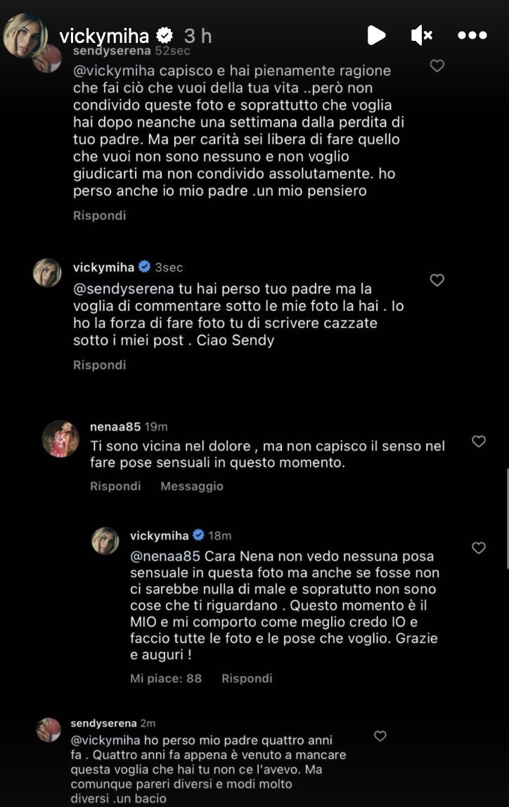 "Non vedo nessuna posa sensuale in questa foto, ma anche se fosse non ci sarebbe nulla di male e soprattutto non sono cose che ti riguardano. Questo momento è il mio e mi comporto come meglio credo, faccio tutte le foto e le pose che voglio", questa una delle riposte della figlia di Mihajlovic che poi in un altra story ha pubblicato diverse emoticons molto esplicative del suo pensiero.