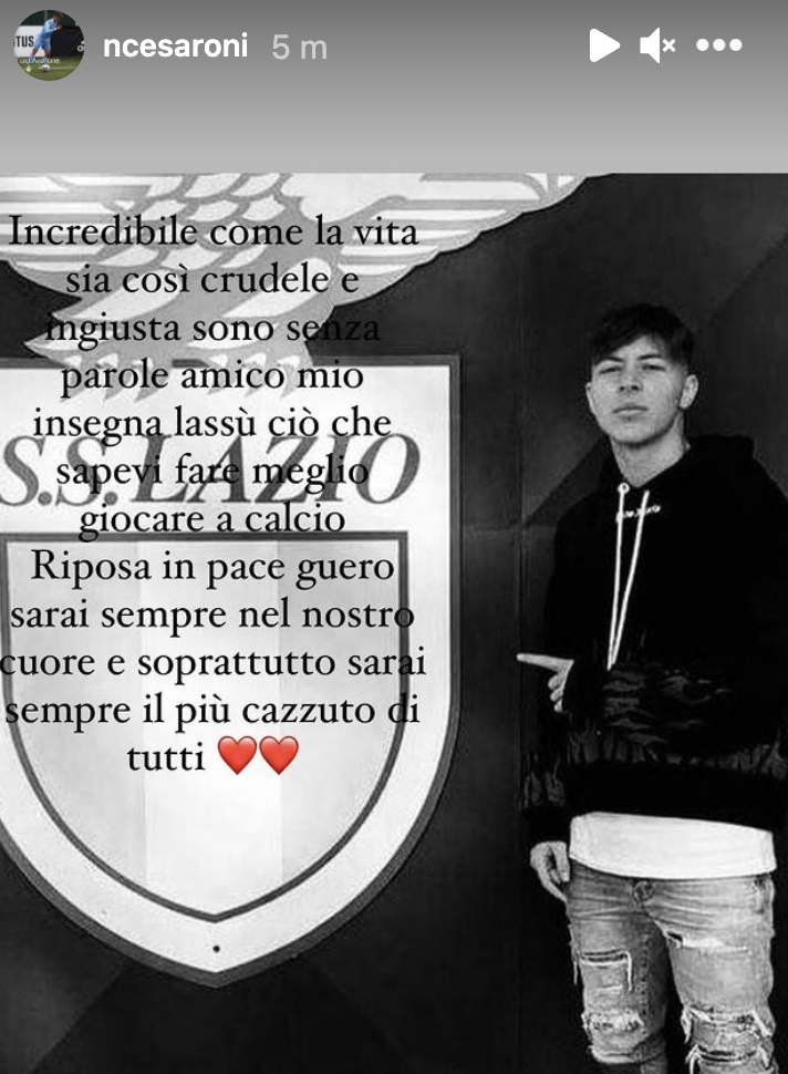 "Incredibile come la vita sia così crudele è ingiusta. Sono senza parole amico mio. Insegna lassù cosa sapevi fare meglio, giocare a calcio. Riposa in pace Guero. Sarai sempre nel nostro cuore e soprattutto sarai sempre il più cazzuto di tutti". Questo il toccante messaggio pubblicato sui social da Nicolò Cesaroni, compagno di squadra di Daniel Guerini nella Lazio Primavera. Con queste parole, Cesaroni ha salutato per l'ultimo volta il suo caro amico che questa sera si è spento dopo un incidente stradale a Roma.
