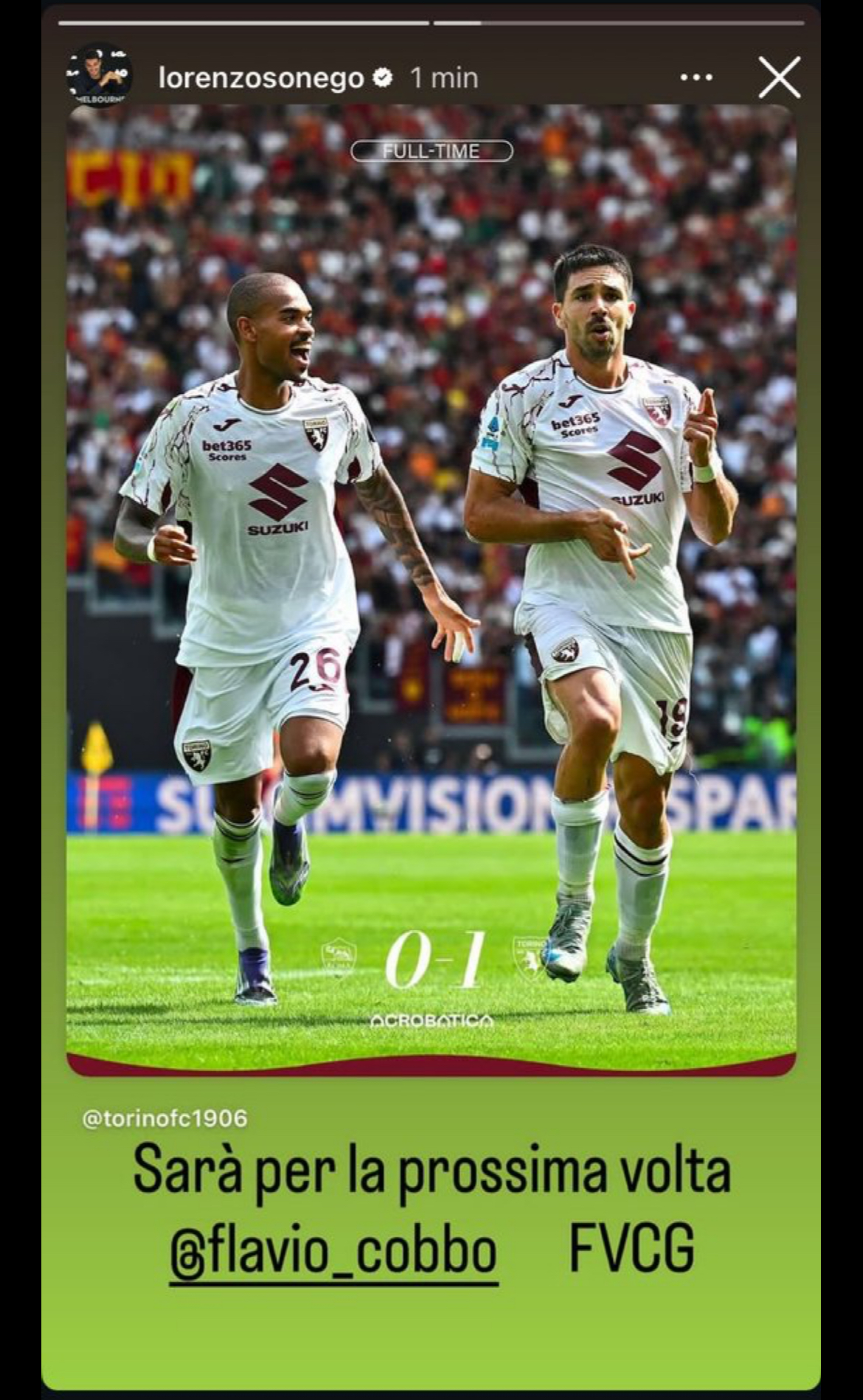 Prima sconfitta della stagione per la Roma di Gasperini. All'Olimpico è il Torino a vincere grazie al gol del Cholito Simeone, che regala i primi tre punti del campionato (oltre al pareggio contro la Fiorentina) all'ex Lazio Baroni in panchina. Su Instagram, dopo il triplice fischio, è partito lo sfottò tra tennisi: Lorenzo Sonego, grande tifoso granata, ha preso in giro Flavio Cobolli, di fede romanista, con una storia. "Sarà per la prossima volta", si legge sotto il risultato. Di seguito la foto.